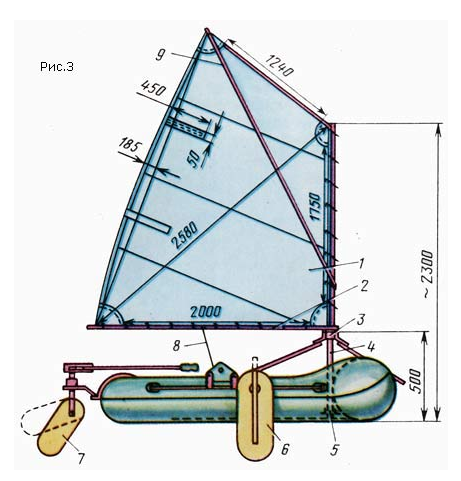 Нет необходимости копировать парусное вооружение спортивной яхты: оно хорошо только в сочетании с типично яхтенным корпусом, позволяющим судну идти к направлению ветра под углом 30-35°. Корпус обычной лодки на это не рассчитан, ее просто понесет боком.
