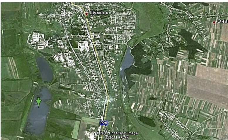 На вихідних, 28-29 серпня, випала нагода поїхати на риболовлю з батьком та його друзями в Шумськ, де я раніше ніколи не бував, проте чув від багатьох знайомих. Отже, готую снасті, прикормку та наживку, забираємо по дорозі друзів та близько 15:30 виїжджаємо дружньою компанією зі Здолбунова :73562:. Годинка дороги до Шумська і майже відразу за містом відкривається прекрасний краєвид на озеро, де ми й збираємося рибалити. Оскільки в Шумську є 3 великих стави, стрілочкою на карті позначив те, на якому ловили ми (зліва знизу).