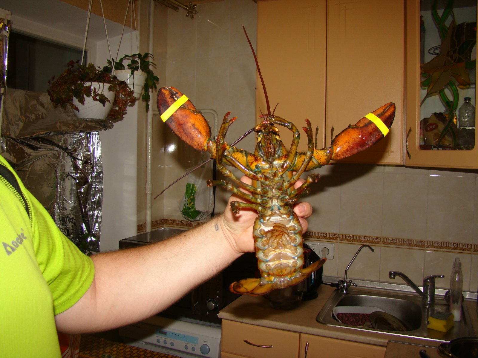 Вот решили попробовать новое для меня блюдо-лобстеры.С начала были *словлены*в китайском магазине без труда и лицензии.Затем доставлены на кухню домашнюю и приготовлены.Перед тем как отправить в кастрюльку-были опробованы клешни на прикус.Очень даже ничего-карандаш почти перекусан!!!!Скажу что особи по килу 700 не влезли в огромную кастрюлю сразу-пришлось варить по два.17 мин и готово!На вкус...ну очень даже ничего.Конечно все мясо в хвосте и клешнях но лапы под пивко пошли тоже ничего.Вот так-советую.Всем удачи!!!