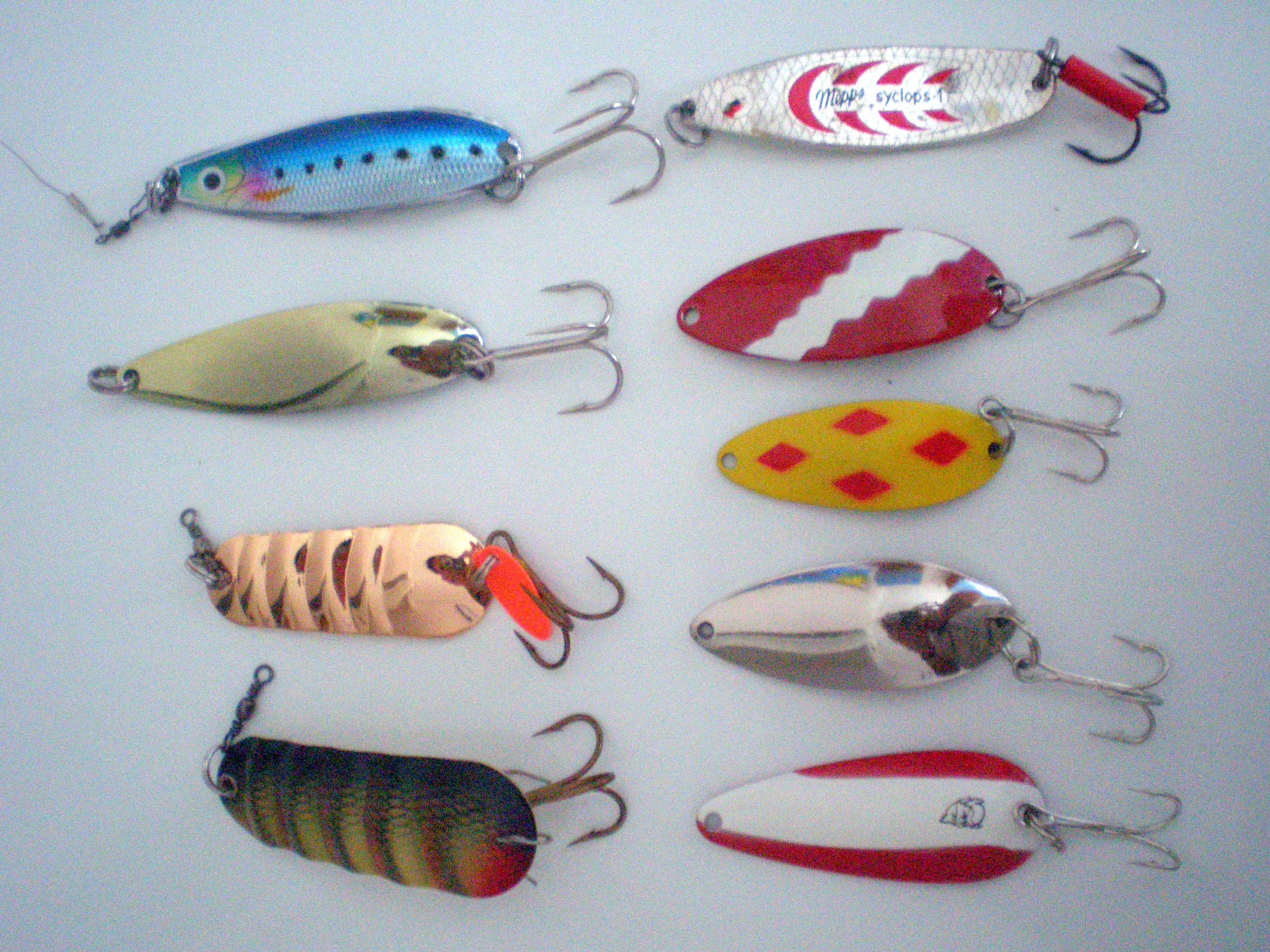 Іноді і сьогодні використовую вертушку (на фото зліва зверху). Щуку в цьому році на неї зловив. В пам"яті є випадок, коли ця вертушка творила чудеса. А саме на таку коливалку (здається не помиляюсь) як крайня справа зверху був зловлений мій перший судак на спінінг