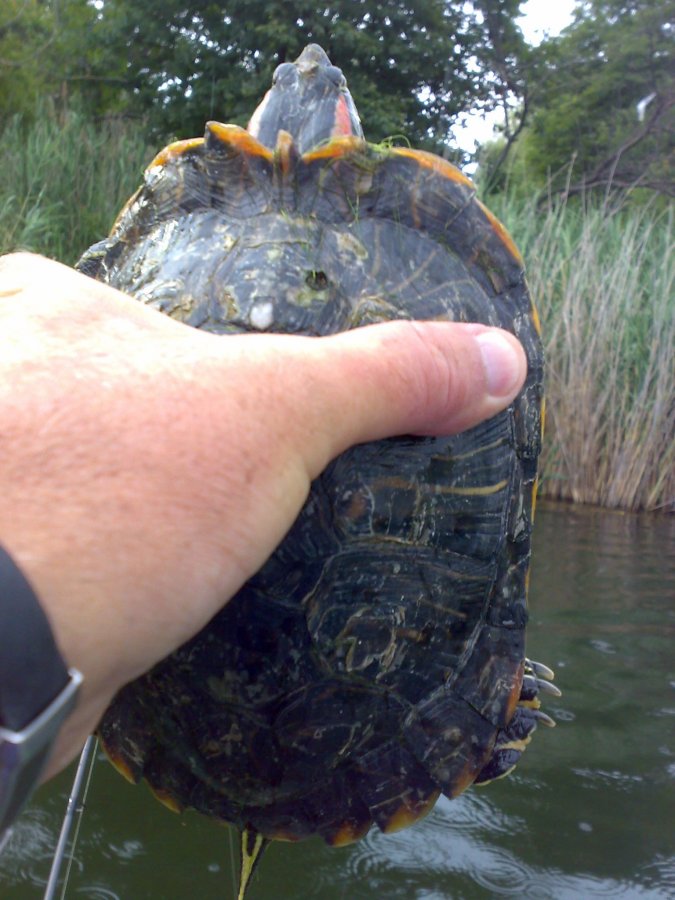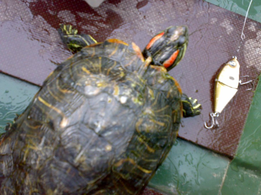 Красноухая южноамериканская черепаха на понтуновский Bully Boo. Пока от тройника её освобождал - укусила два раза, зараза такая..