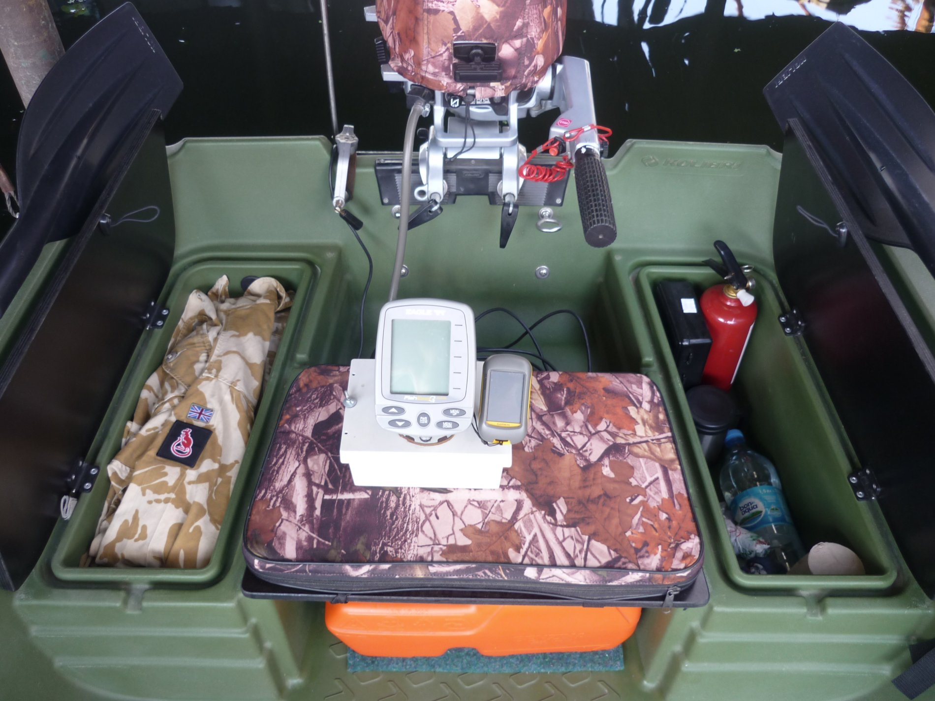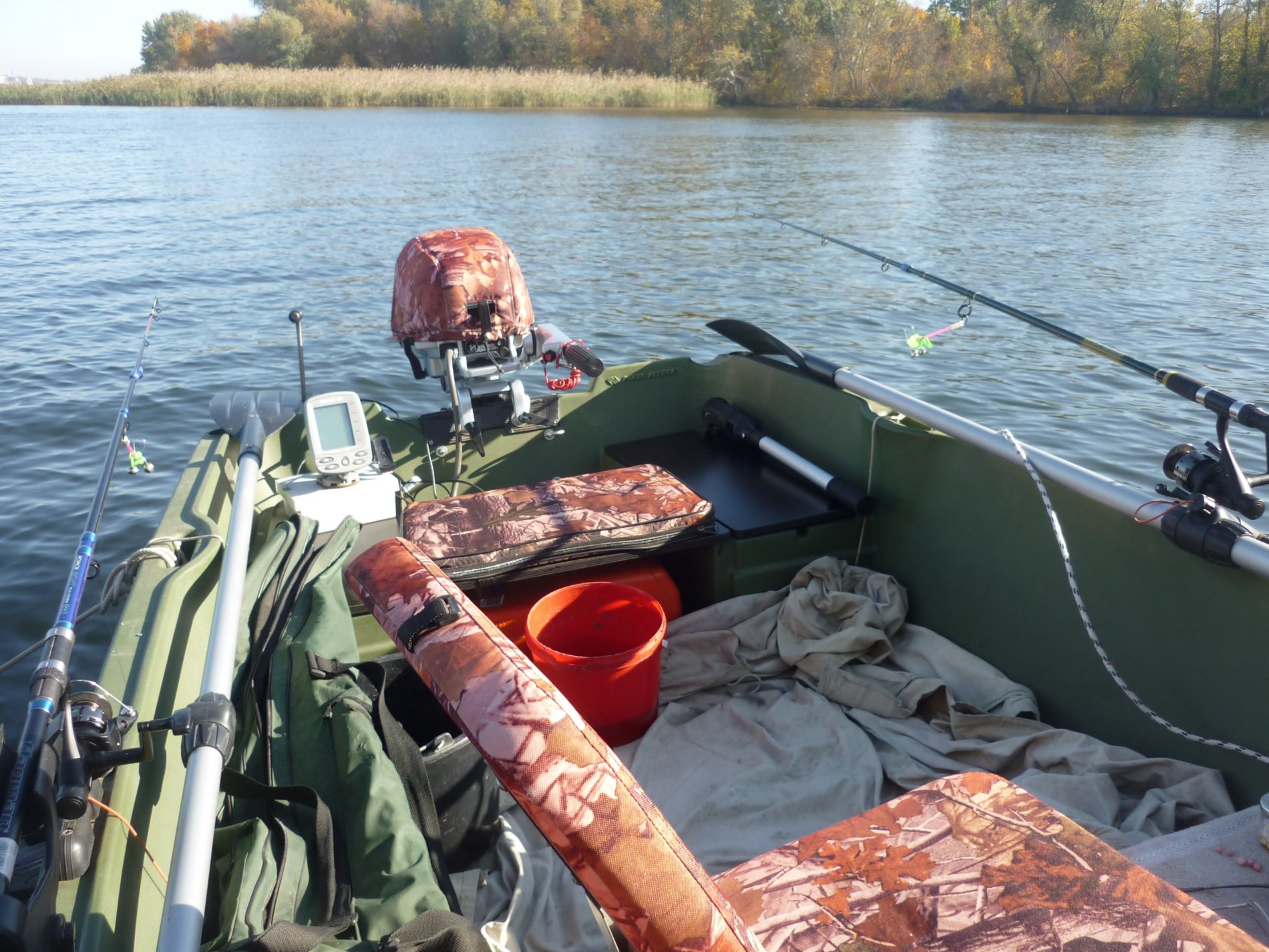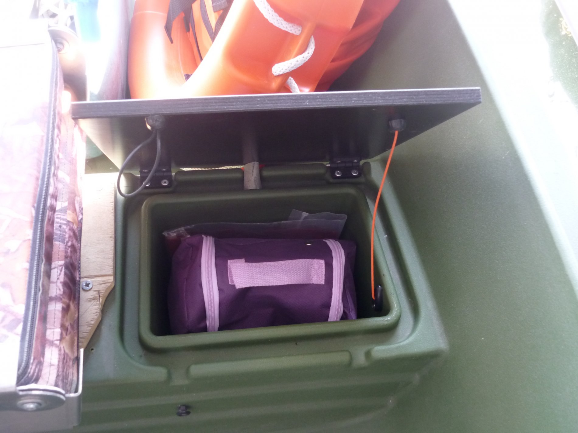 Всех приветствую! 2 года назад перед покупкой лодки RKM-350 информации о ней было ограничено, а реальных отзывов вообще не было. Предлагаю мой вариант по обустройству лодки, возможно кому-то пригодится. В кокпите имеется 5 сухих рундуков( 2 на задней, 2 на средней, 1 носовой банке). В левом заднем я разместил огнетушитель, аптечку и другие предметы первой необходимости. В правом заднем - вещи( от весны до осени).В левом рундуке на средней банке - принадлежности для рыбалки. В правом - документы. ЗИП для мотора, катушки и.т.д. В носовом рундуке тоже храню вещи. По опыту после дождя всё в рундуках сухое. Для хранения якорей приспособил старую полиэтиленовую канистру, срезав боковую часть.Туда вмещается 100 метров каната и 2 якоря. Основной якорь Холла-15Lb(7.5кг) - держит лодку на любой волне и ветре.Также в носовом отсеке разместил справа спасательный круг и жилет.Для управления со средней банки использую телескопический удлинитель румпеля. В зависимости от волнения управляю мотором со средней или задней банки.Дисплей эхолота и навигатор разместил на пластиковом боксе, который при необходимости можно перемещать в любое место лодки, а хранить в рундуке.Держатели для удилищ установил для разных условий ловли( с левого.правого борта.с кормы под тентом и без тента) На средней банке установил поворотное кресло, которое всегда можно снять. Всё видно на фото.