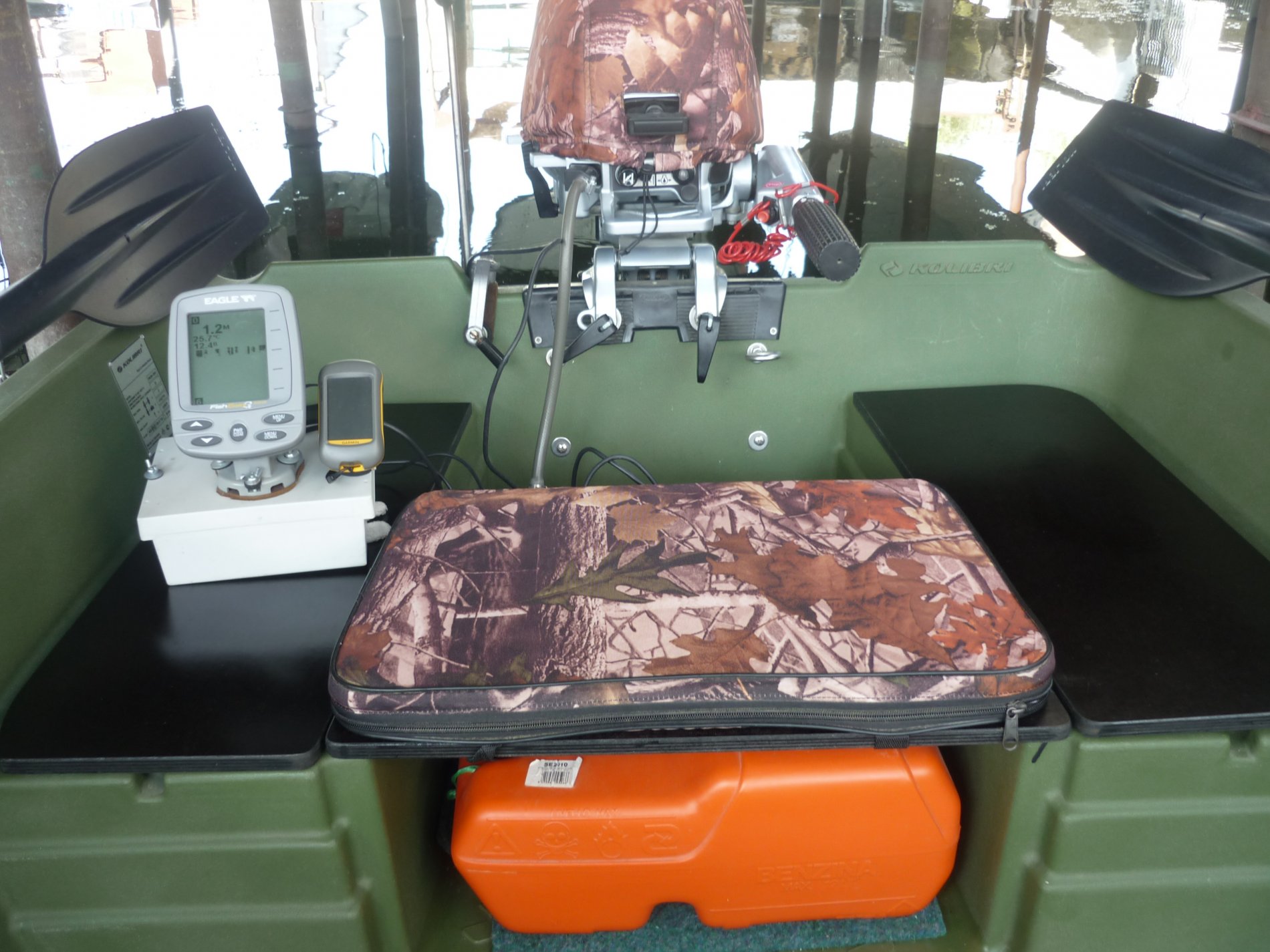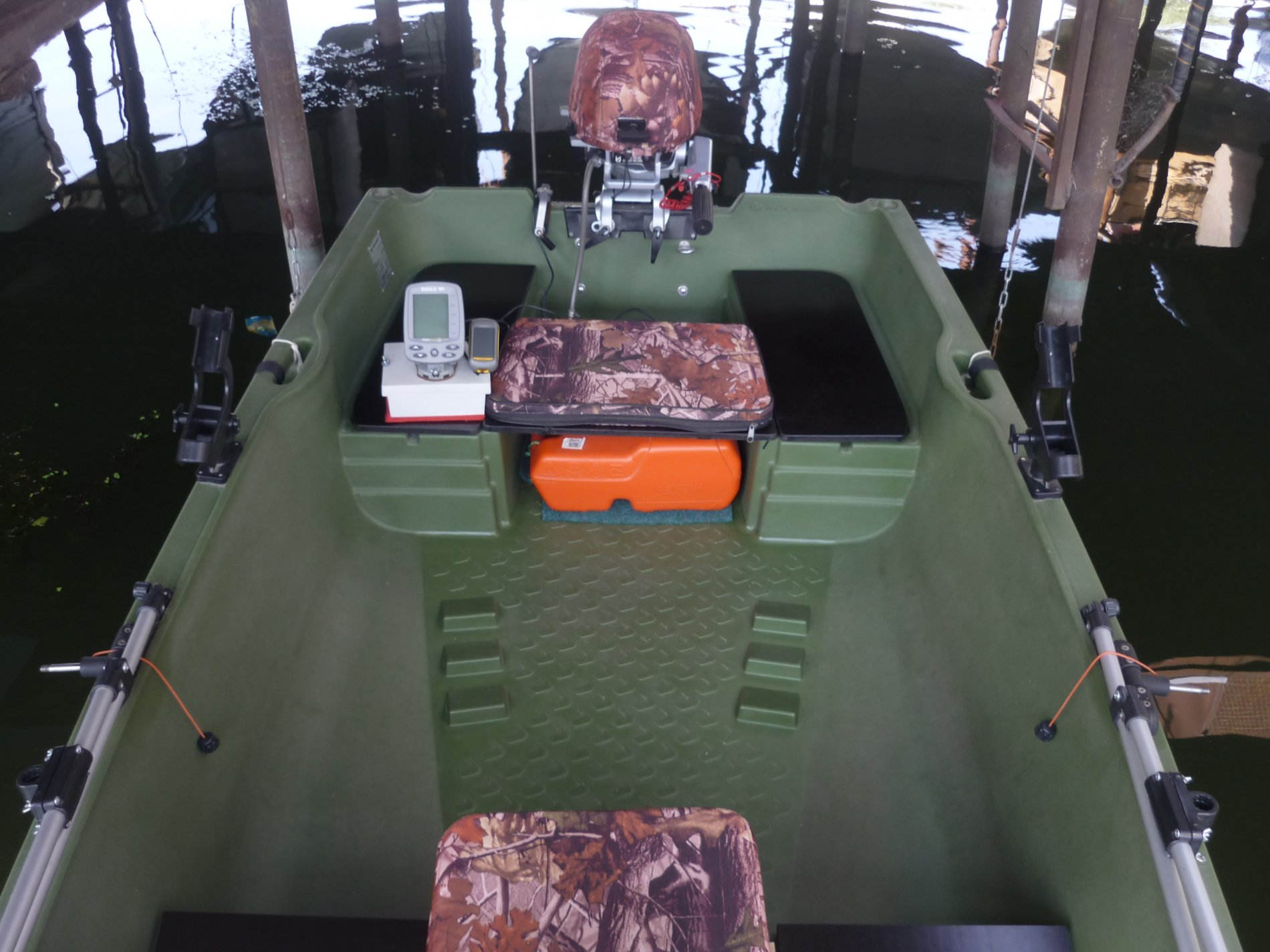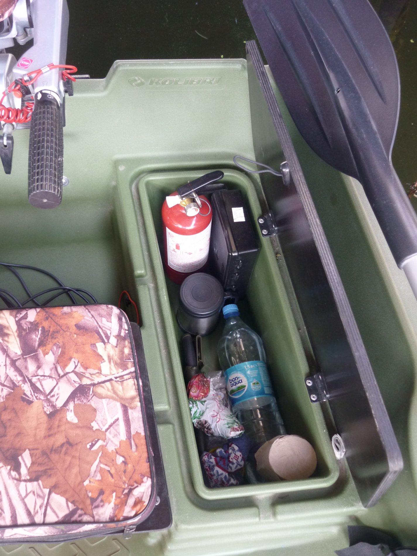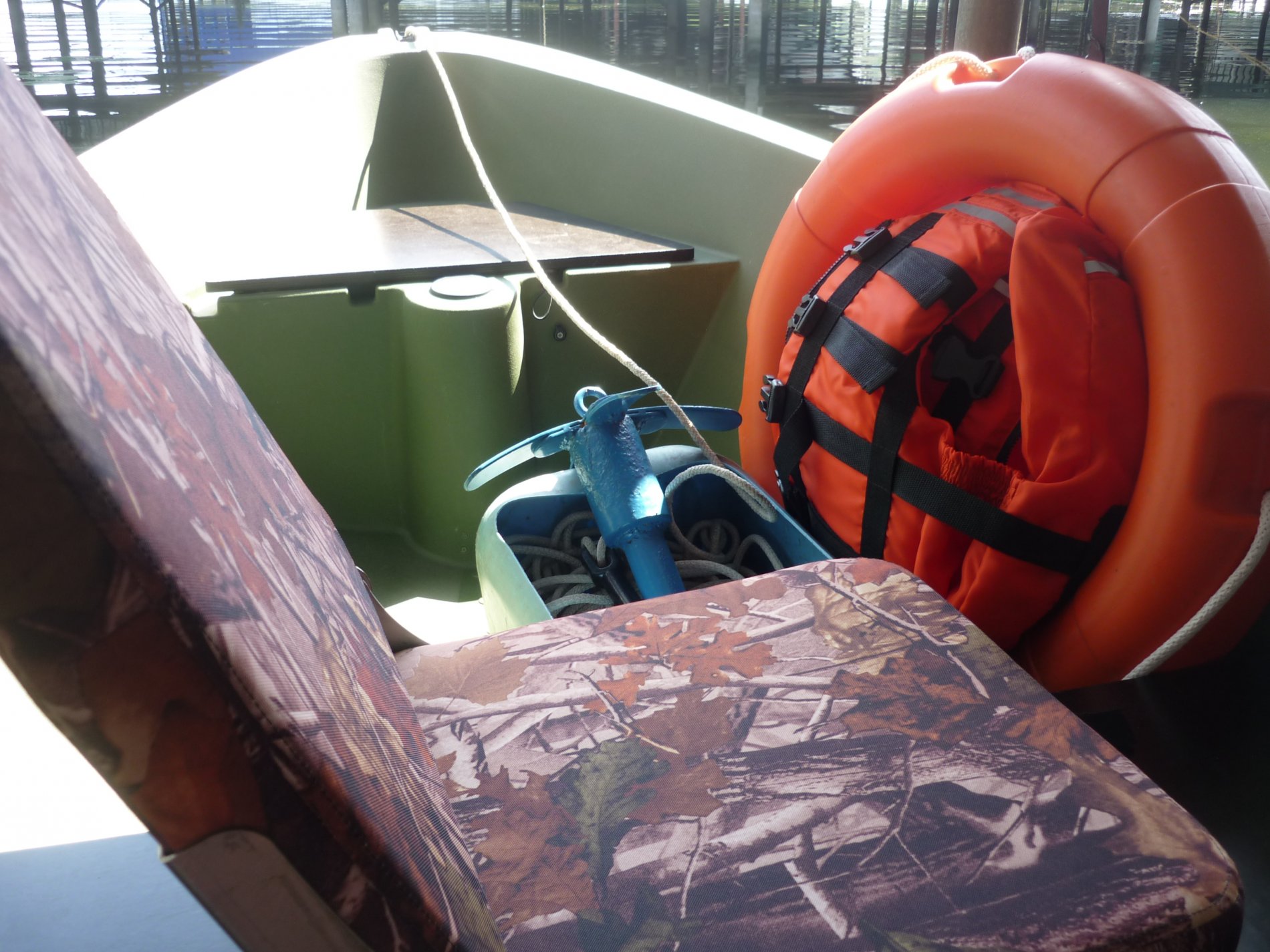 Всех приветствую! 2 года назад перед покупкой лодки RKM-350 информации о ней было ограничено, а реальных отзывов вообще не было. Предлагаю мой вариант по обустройству лодки, возможно кому-то пригодится. В кокпите имеется 5 сухих рундуков( 2 на задней, 2 на средней, 1 носовой банке). В левом заднем я разместил огнетушитель, аптечку и другие предметы первой необходимости. В правом заднем - вещи( от весны до осени).В левом рундуке на средней банке - принадлежности для рыбалки. В правом - документы. ЗИП для мотора, катушки и.т.д. В носовом рундуке тоже храню вещи. По опыту после дождя всё в рундуках сухое. Для хранения якорей приспособил старую полиэтиленовую канистру, срезав боковую часть.Туда вмещается 100 метров каната и 2 якоря. Основной якорь Холла-15Lb(7.5кг) - держит лодку на любой волне и ветре.Также в носовом отсеке разместил справа спасательный круг и жилет.Для управления со средней банки использую телескопический удлинитель румпеля. В зависимости от волнения управляю мотором со средней или задней банки.Дисплей эхолота и навигатор разместил на пластиковом боксе, который при необходимости можно перемещать в любое место лодки, а хранить в рундуке.Держатели для удилищ установил для разных условий ловли( с левого.правого борта.с кормы под тентом и без тента) На средней банке установил поворотное кресло, которое всегда можно снять. Всё видно на фото.