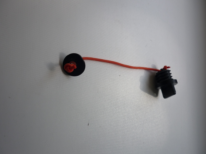 У производителя заказал уже 2 пробки и через 2 дня их получил. Сначала при осмотре не понял для чего это вся конструкция из пробки и резиновой прокладки на шнурке, уже было хотел отрезать этот шнурок и оставить одну пробку. Оказалось, что производитель предусмотрел, чтобы пробка при откручивании не потерялась, сначала в отверстие проталкивается резинка по длине шнурка и потом закручивается пробка. При откручивании пробки она просто остаётся висеть на шнурке - всё просто и безопасно. Спасибо производителю за эту доработку, теперь можно не волноваться, что эта пробка потеряется.