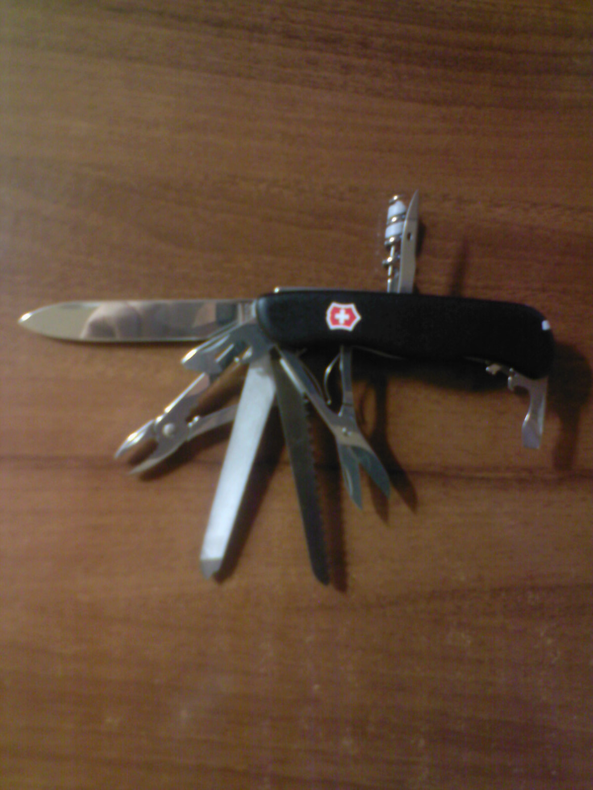 Внимательно изучив ножик, опробовав его в деле, покрутив его так и сяк, изучив инфу в инэте - я обрадовался. Этот "резатель" - не совдеповский перочинник. Великолепное качество стали, очень мощное и надежное строение, необычайное количество функций, которое сразу раздражали даже (от зубочистки до надфилька для заточек, ножовки по дереву:ng_wacko: ), позже только радовали ибо исполнение ихнее просто отменное: к примеру ножовочка сидит мощно, а отточенна просто бомба.