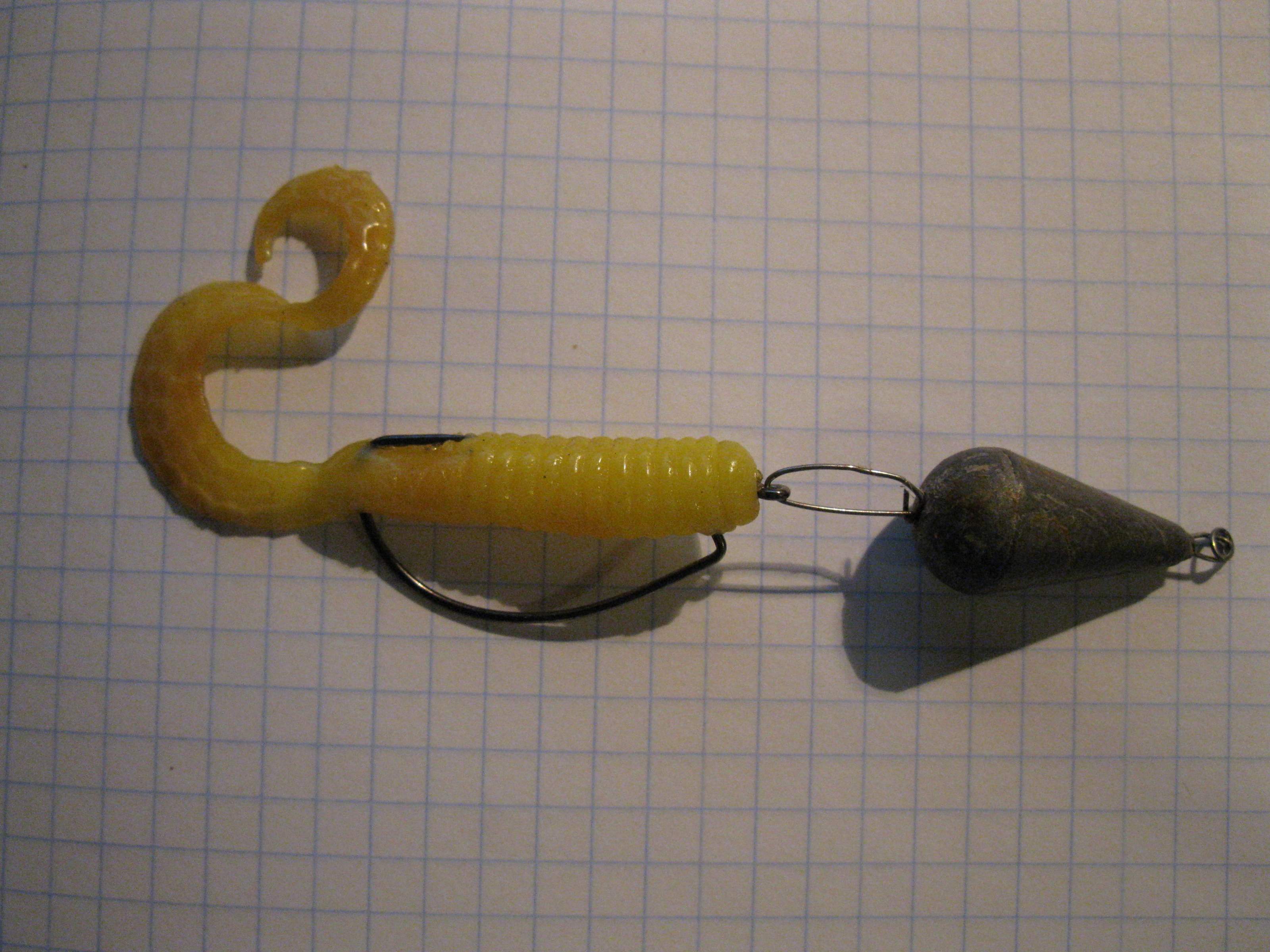 Ну і як варіант бюджетної оснастки можу запропонувати як на фото: груз капля, саморобний карабінчик із пружинної проволоки і офсетний гачок із менсовським твістером. На другому фото судачок, зловлений в минулу неділю саме на цю оснастку.