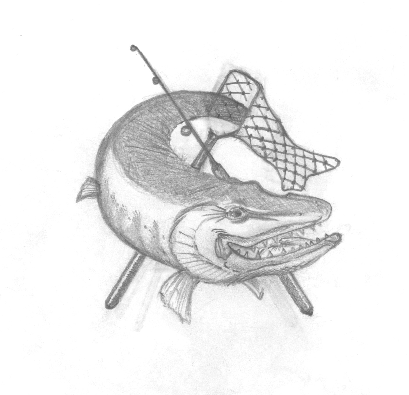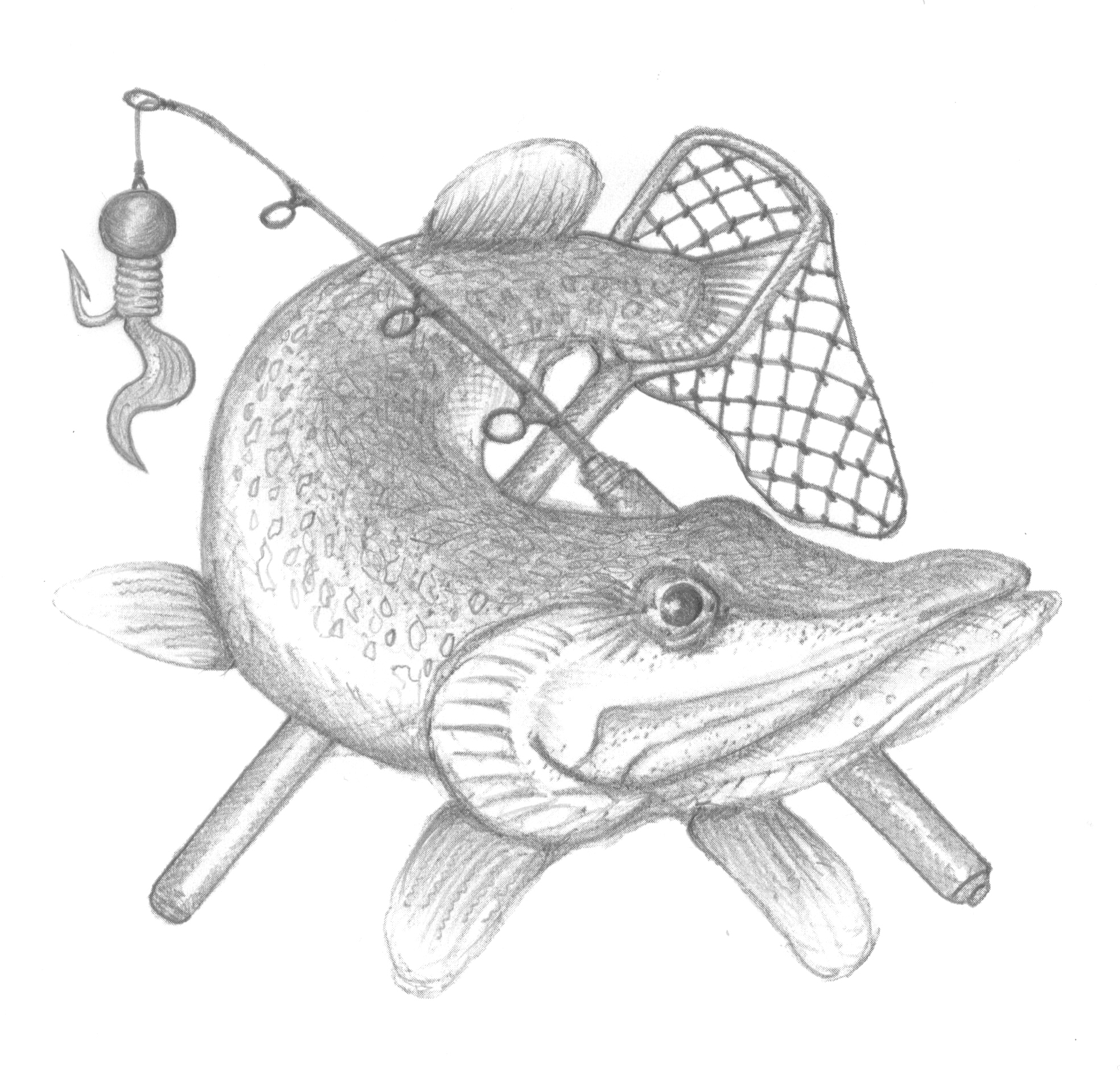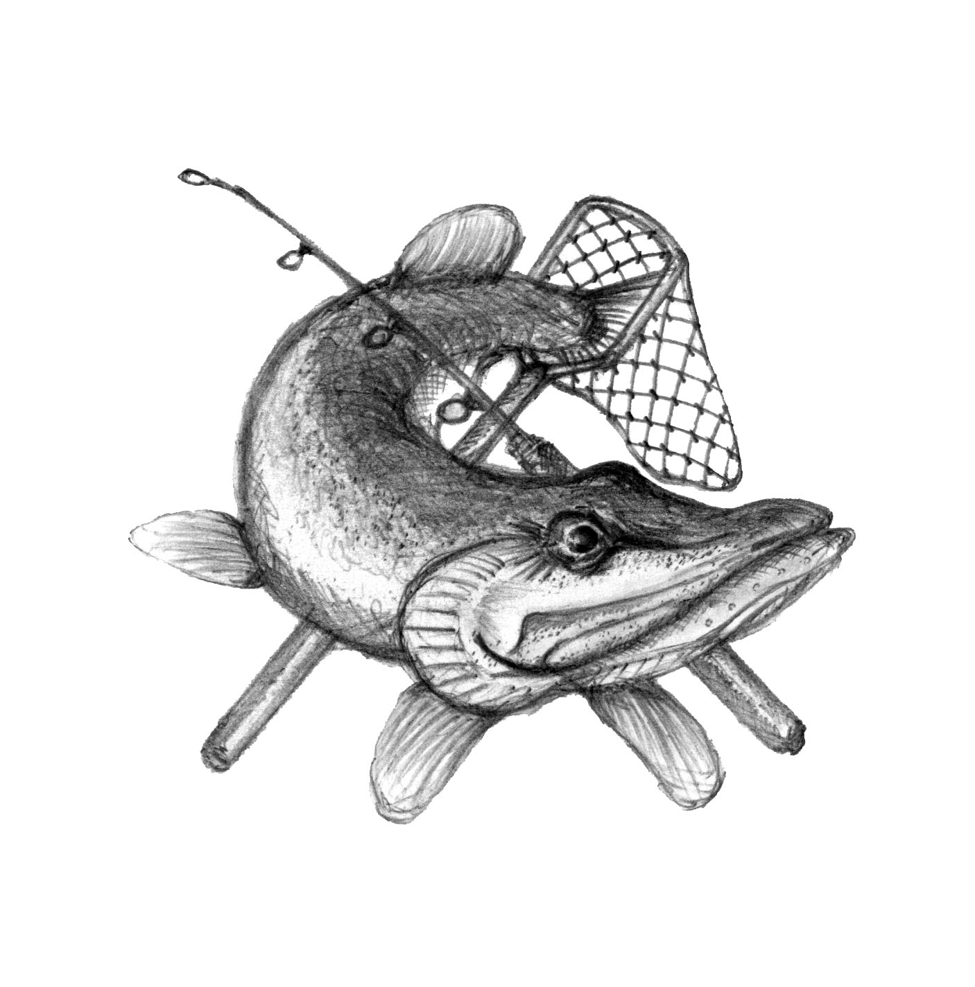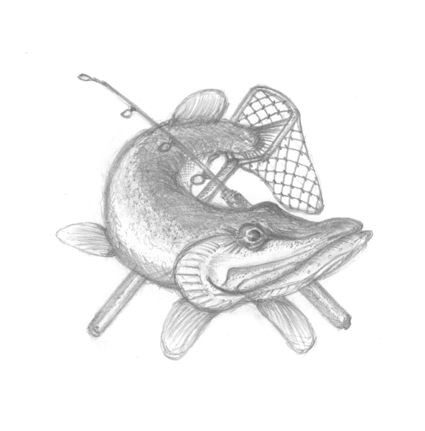 1. Суть композиции: пожалуй, наиболее распространенный хищный трофей (щука) обвивает наиболее распространенные рыбацкие аксессуары: спин и подсак. Так что это, по моей задумке лучше оставить;