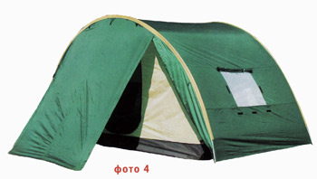 Двускатная палатка (фото 3) имеет классическую, хорошо знакомую нам форму. Ее каркас состоит всего лишь из нескольких прямых трубок, поддерживающих конек палатки. Натяжение самой палатки и тента, если тот существует, осуществляется с помощью множества оттяжек, требующих воткнутых в грунт колышков (крючков).
