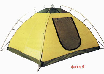 Ее основное предназначение - быть удобным и сухим жильем. Для этого она (фото 6) должна обладать хорошей вентиляцией, защищать от капель конденсата, которые могут попасть на нее с внутренней поверхности тента, но, в то же время, должна быть прочной и легкой. Поэтому ткань для внутренней палатки подбирается с учетом этих свойств. Но показатель степени водонепроницаемости достаточно иметь более скромный - около 1500 мм.