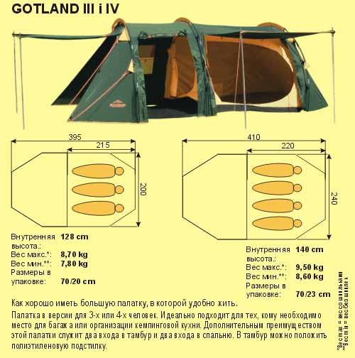 Спальня на 3-4 человек, тамбур. По 2 входа в тамбур и спальню. Спальня 2,4 х 2,1м, длина тамбура - 1,5м. Высота – 130 см. Но пространство ограничено перекрестными дугами. Водостойкость: потолок – 2500 мм, пол – 4000 мм. Выдержит несколько дней сильных дождей.