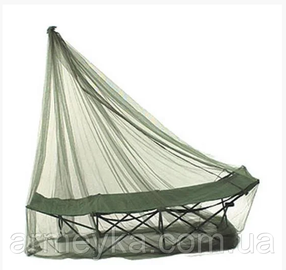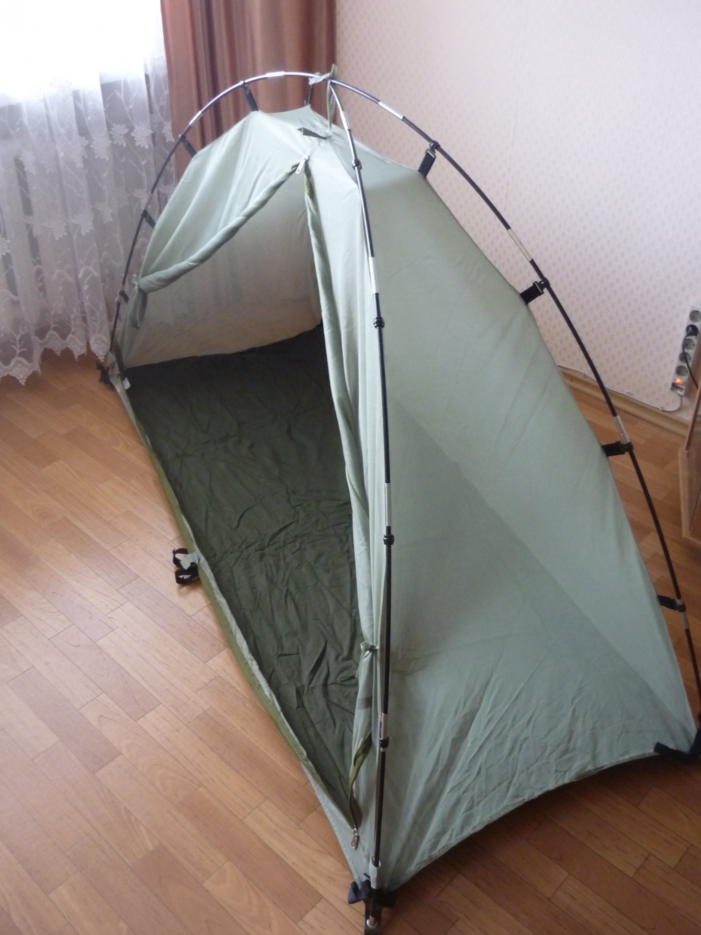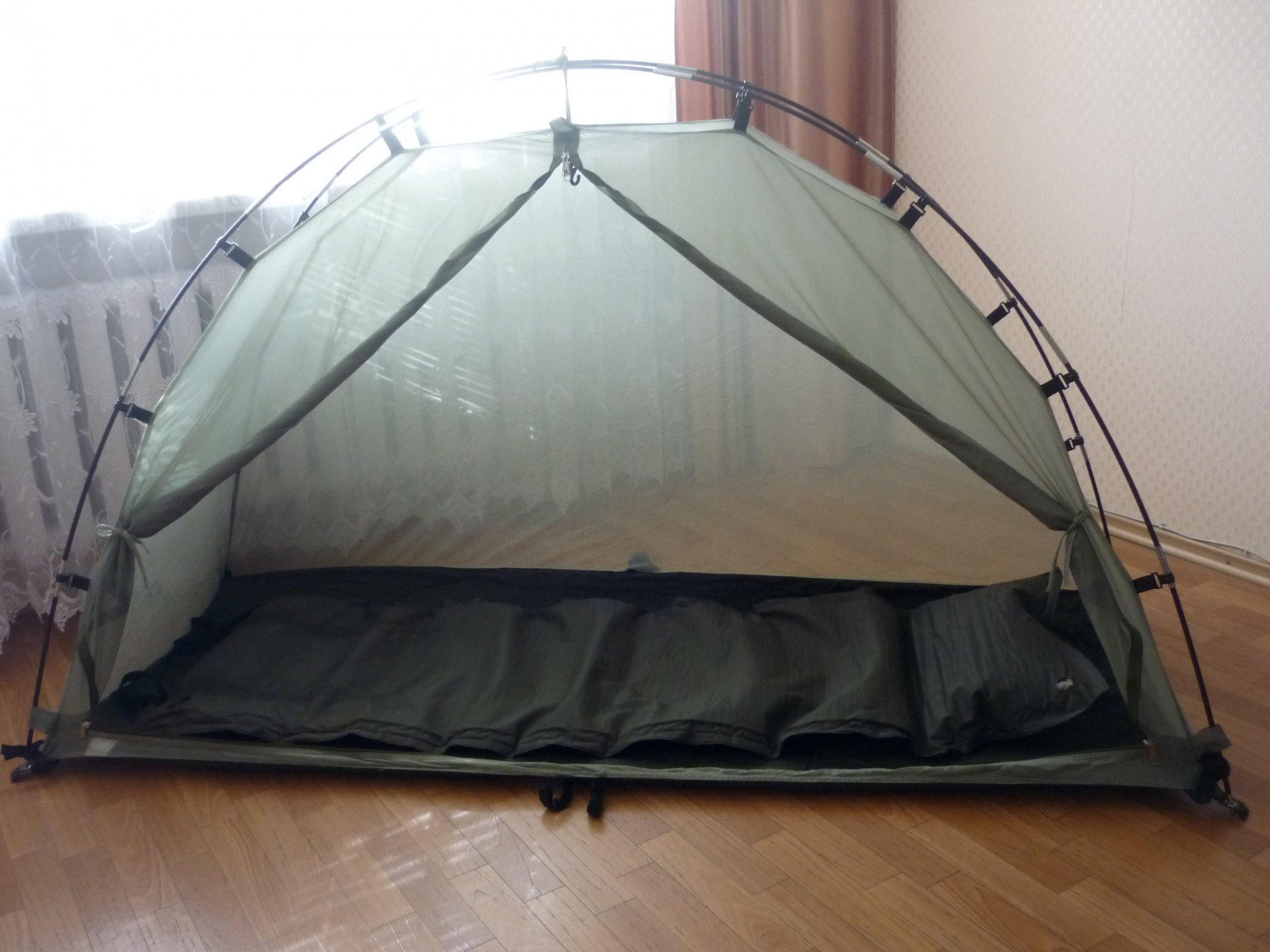Это отдельная палатка, которая может располагаться как на поверхности, причём устойчиво стоит, так и у неё имеется 12 креплений на раскладушку. За счёт универсальности креплений её можно использовать в разных условиях.Качество изготовления понравилось. Размеры внутренние - длина - 1м80см., ширина - 75см, высота - 1м05см. Дно выполнено из толстой х/б ткани. Передняя стенка расстёгивается посередине и полностью внизу, по бокам имеются подвязки. Сверху на куполе имеется крючок для подвешивания. Собрал за 5 минут, компактная - всё собирается в небольшой чехол. Вес - около 1500 гр.