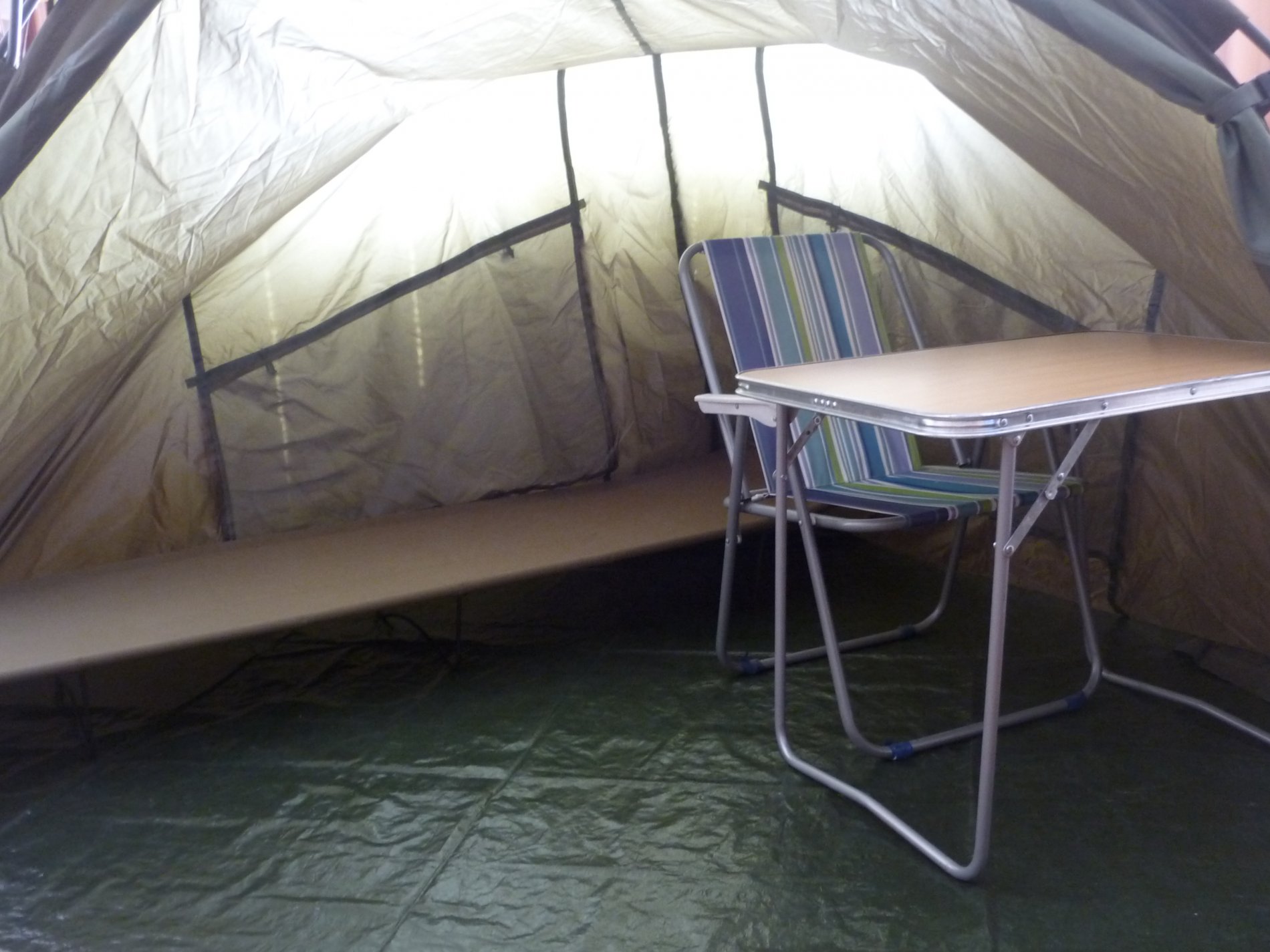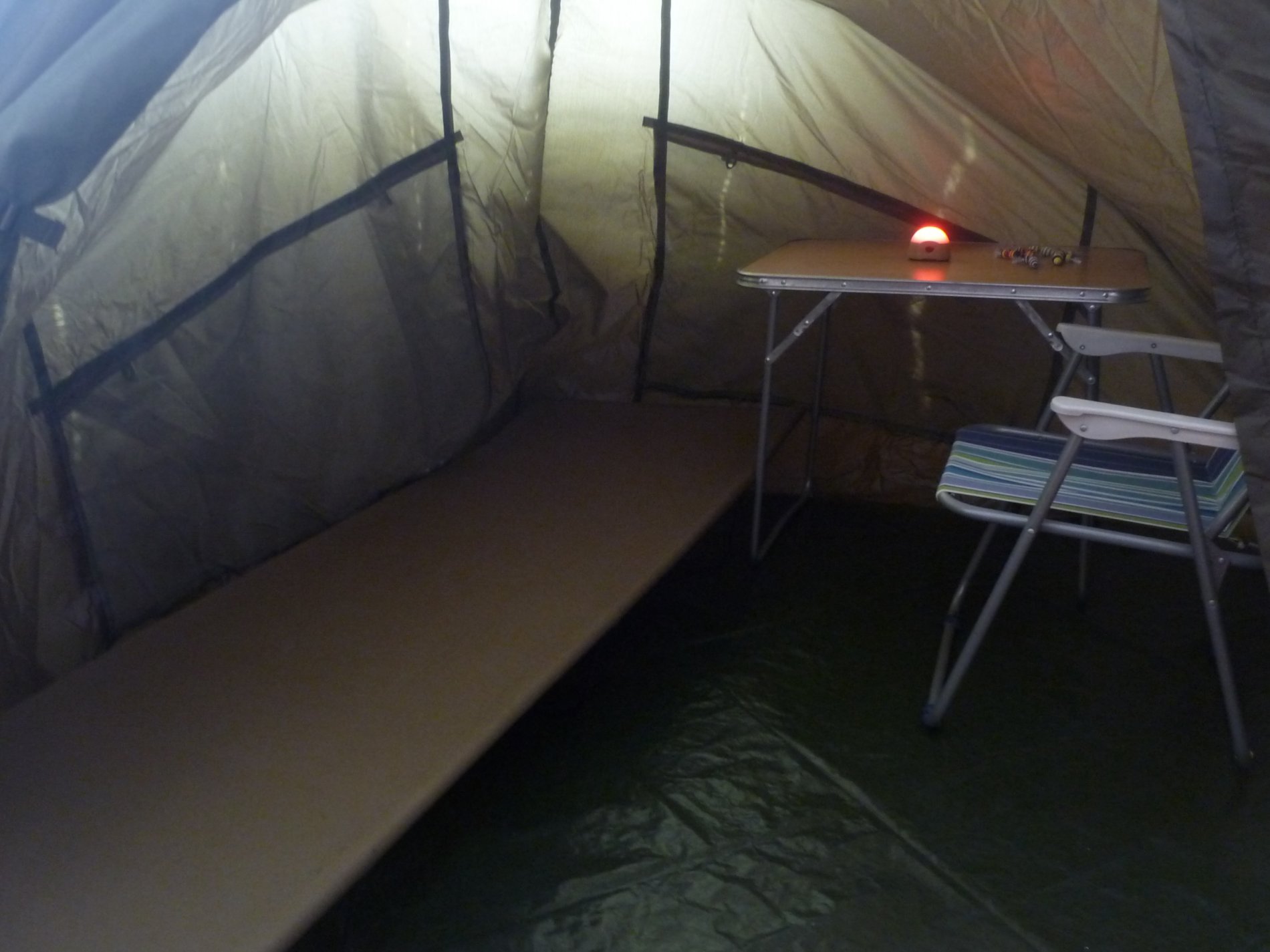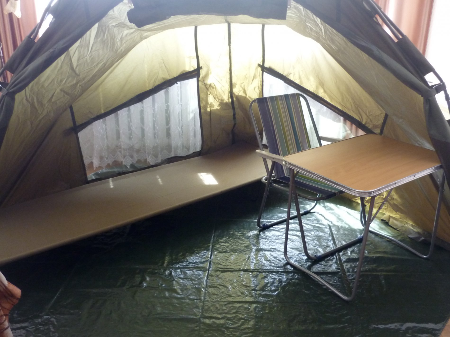 Сегодня прошёл тренаж по сборке - разборке палатки и установки раскладушки, стола,стула. Лучше сейчас всё расставить по своим местам, что бы потом было проще. Раскладушку установил под заднюю левую стенку палатки. Под правую переднюю стенку вошёл стол, ну а стул можно двигать куда хочешь. Как я и планировал всё вместилось, есть место для свободного прохода и вещей. За счёт 5 открытых окон(москитные сетки) освещённость в палатке отличная. В ночное время будет светить кемпинговый фонарь. Так как палатка стоит в комнате без растяжки и колышков, то реально размеры внутри будут ещё больше, но это будет видно уже на рыбалке. Общий вес - палатка, раскладушка, стол,стул получился 15 кг.
