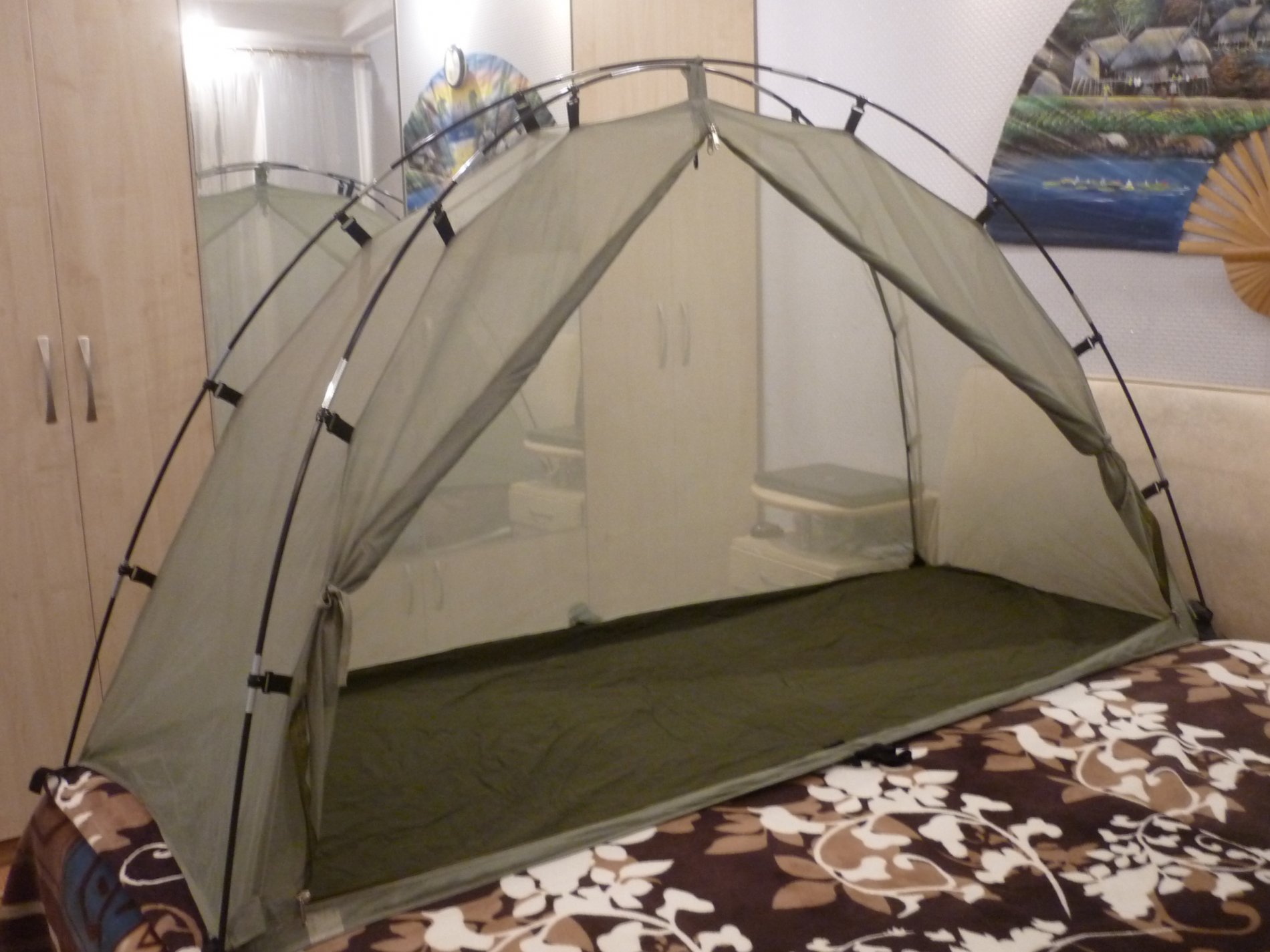 Как сейчас, для одного брал-бы простенькую двух-местную, но двухслойную. По установке две дуги, даже в одно лицо за 5-7 минут максимум, спишь сам, поэтому места хватает даже какие-то вещи оставить.