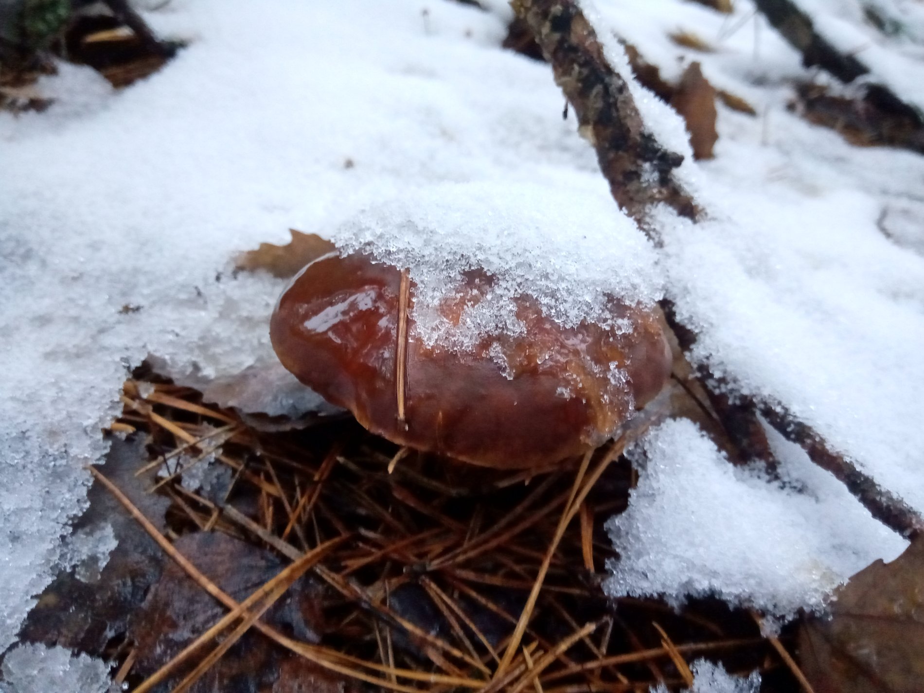 2 декабря, после рыбалки осталось пару часов пока стемнеет. По лесной дороге остановились поискать грибы подснежники, и нашли. Немного польских и целый пакет сыроежек. Поляки торчали из под снега а сыроежки надо было раскапывать бугорки в хвое. В субботу можно брать грабельки и на грибалку за сыроежками.