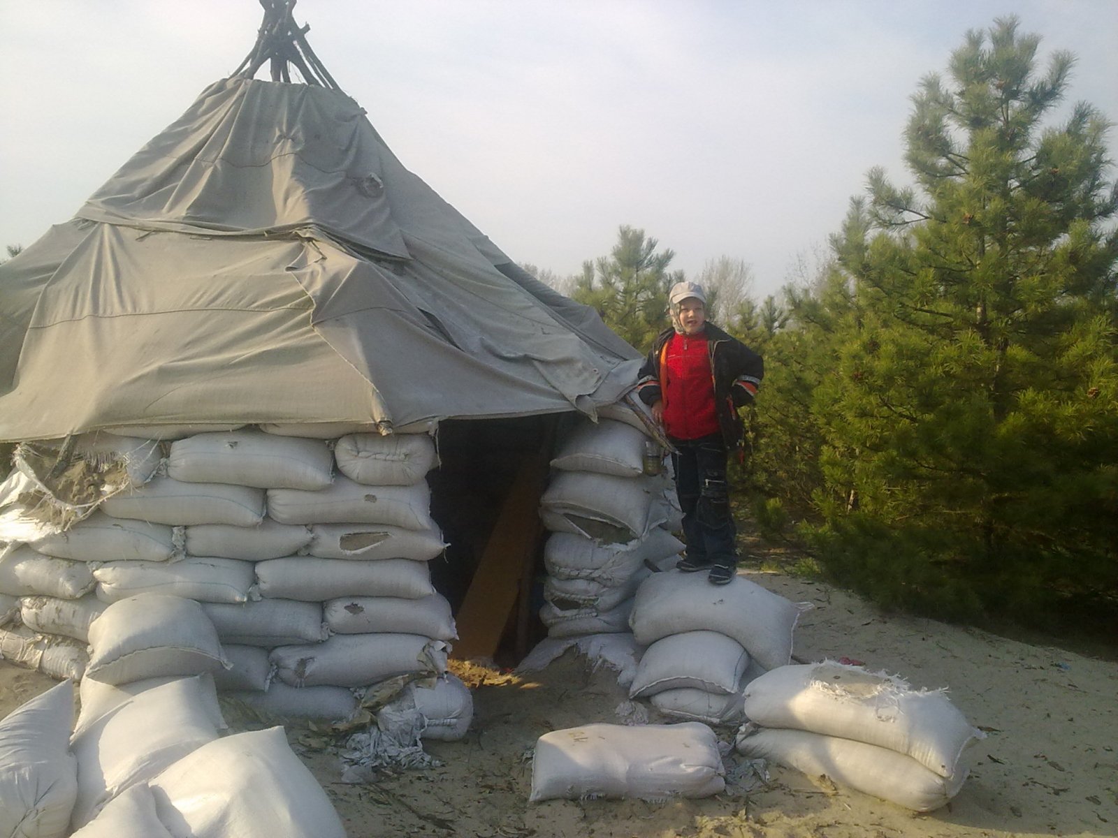 Які там бойові дії, це на острові в межах міста хтось побудував собі на літо. І дешево, і протягом сезону прослужить, і ні яка зараза не зруйнує. Судячи з стану будували у прошлому сезоні, трішки полагодити і ще сезон пропрацює. Моєму сину ця споруда сподобалась каже шо це збудували індіанці чи пірати, я не став заперечувати. Я ж вигадав про остів скелета тепер ще й острів піратів існуватиме, і розташований ближче і дитині до вподоби.