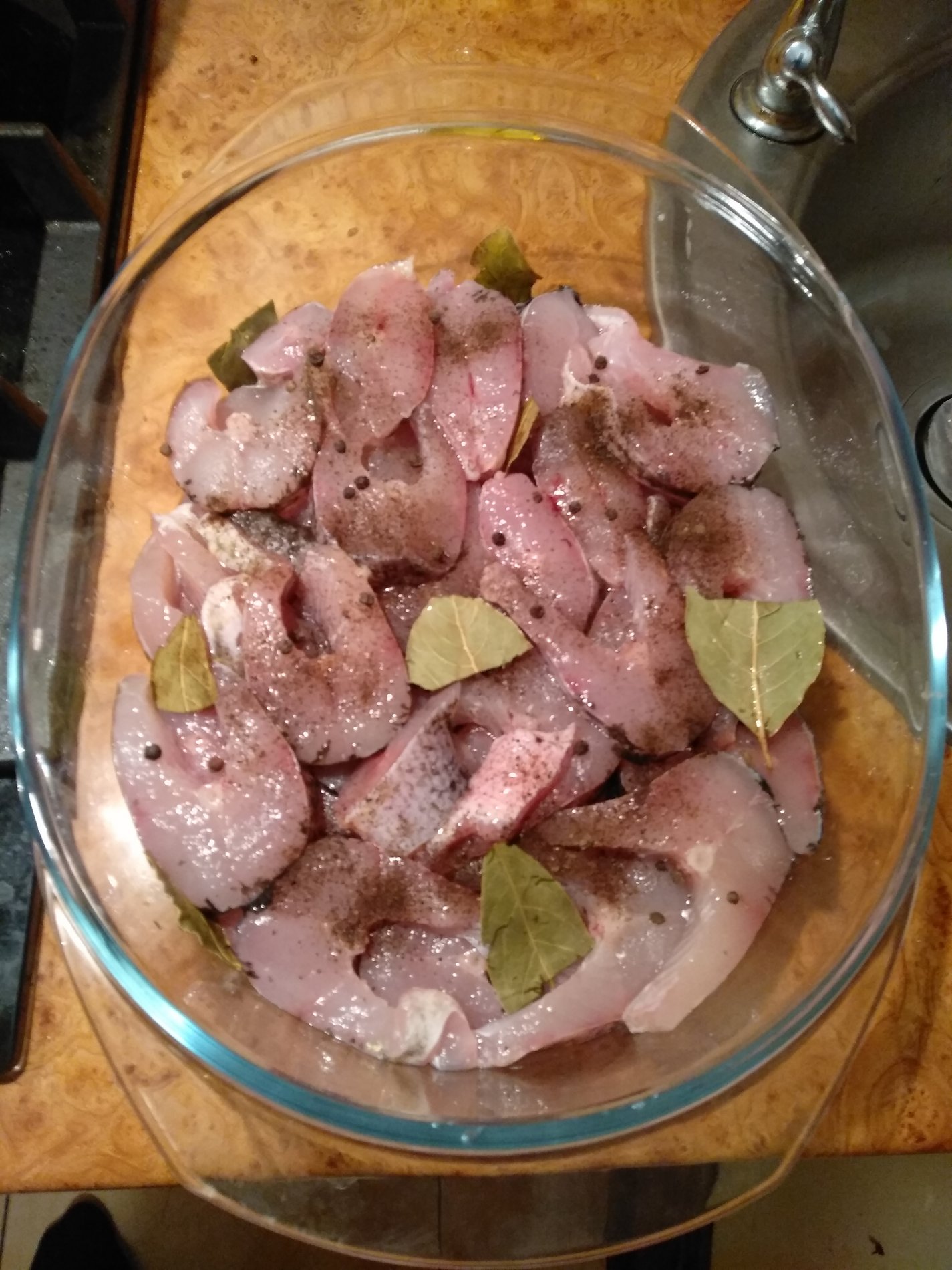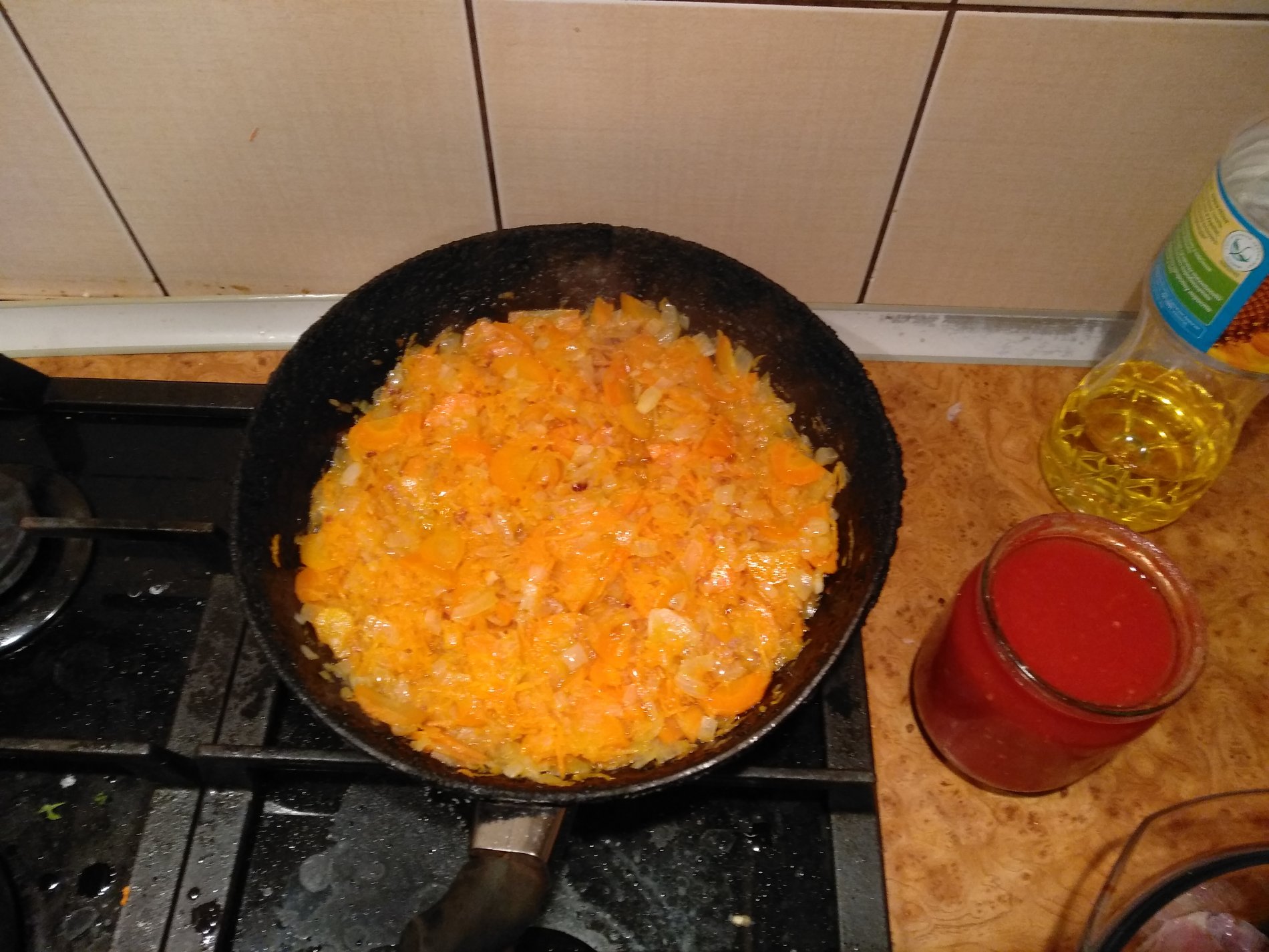 Все просто: лук, морковка, томат (в банке рядом с сковородкой) все обжариваем. Рыбу складываем в любую посуду которую можно в духовку, специи по вкусу.