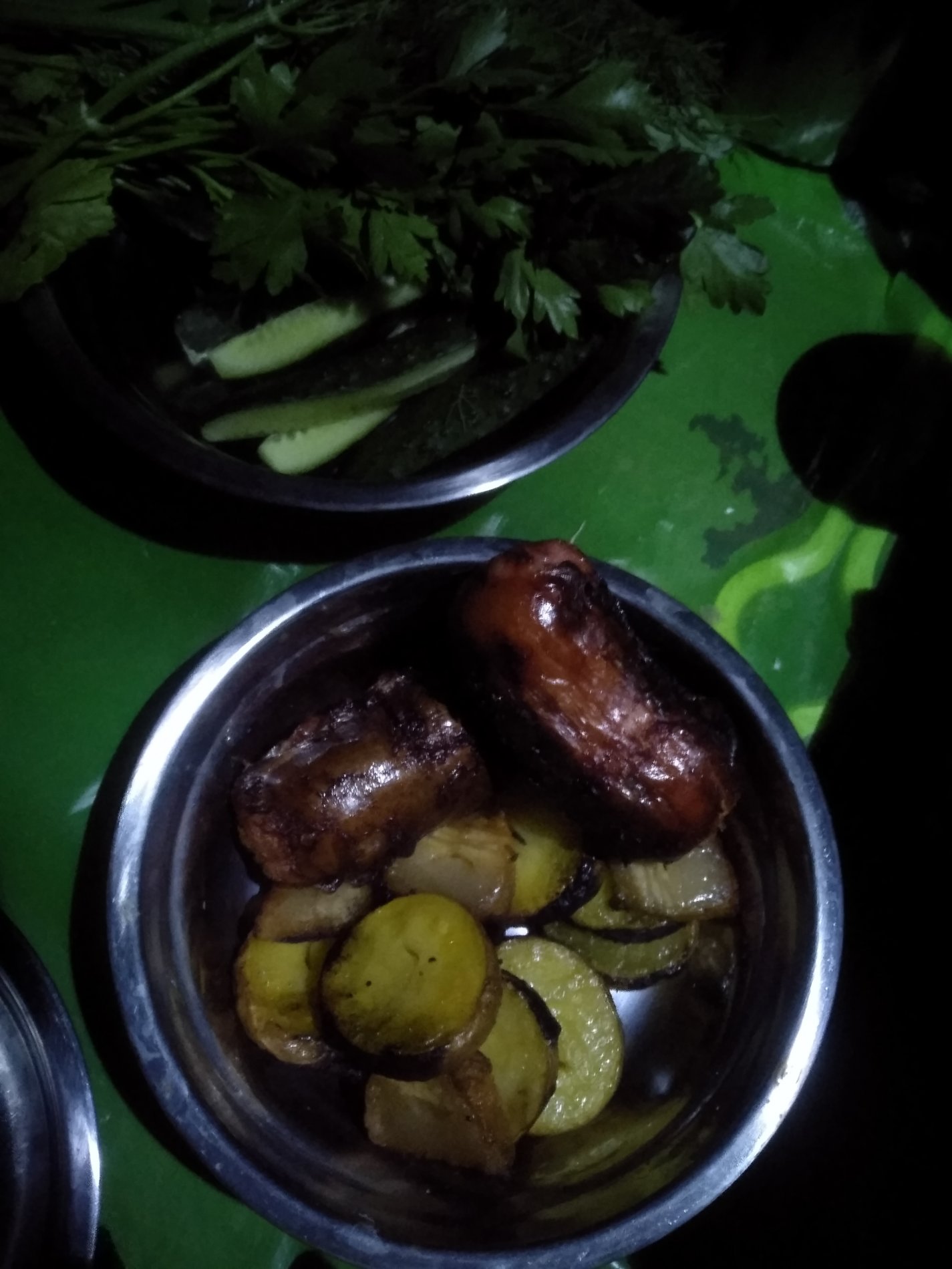 А, вчера на открытии, кушали: уху, шашлык и печёный картофель с салом.