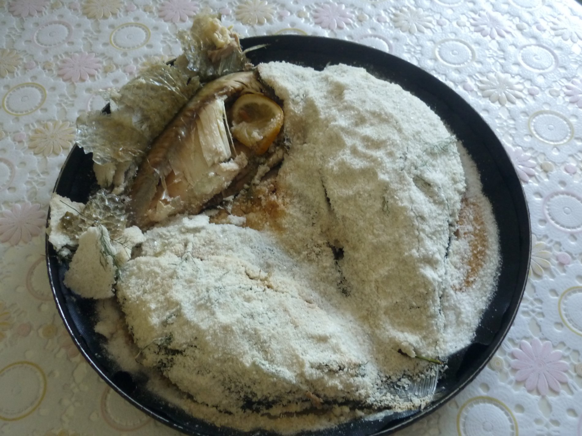Карась не чистится от чешуи, но потрошится и промывается в воде. На дно формы для запекания ровным слоем насыпаем соль. В брюшка рыбы ложим дольку лимона и зелень и укладываем в форму. Сверху опять ровным слоем насыпаем соль, что бы она полностью покрыла рыбу. Духовку разогреваем до 200 гр., ставим туда форму с рыбой и запекаем 40 - 50 мин. У готовой рыбы панцирь соли и кожа с чешуёй отлично снимаются и остаётся сочное и вкусное мясо, ну и полезное, так как ничего не жарится и масло вообще не используется.