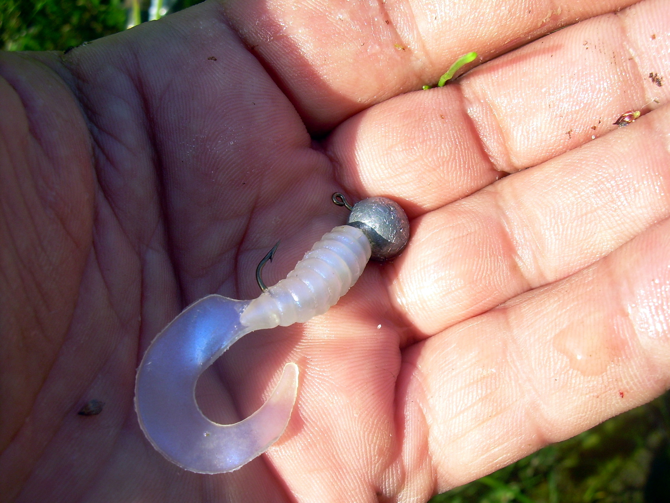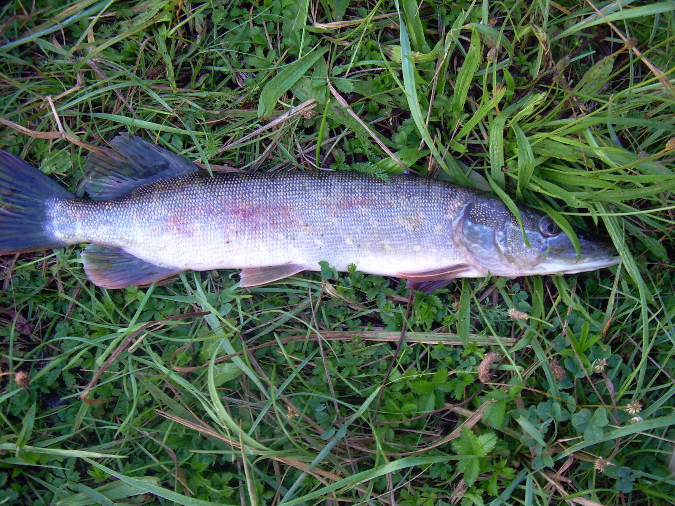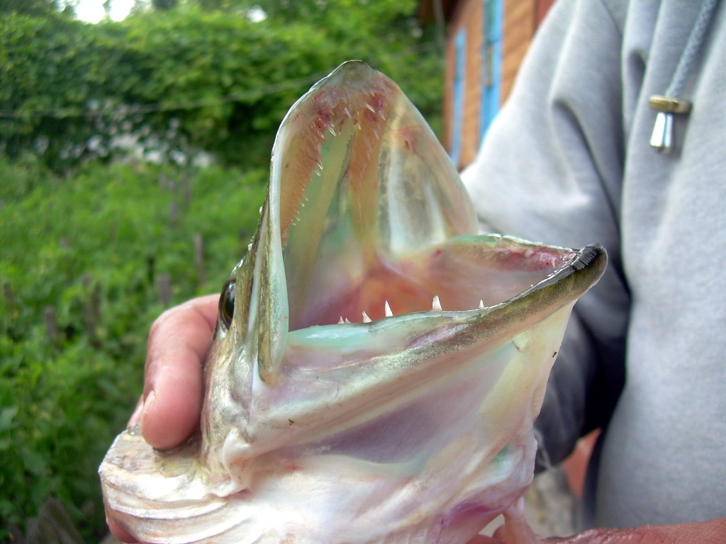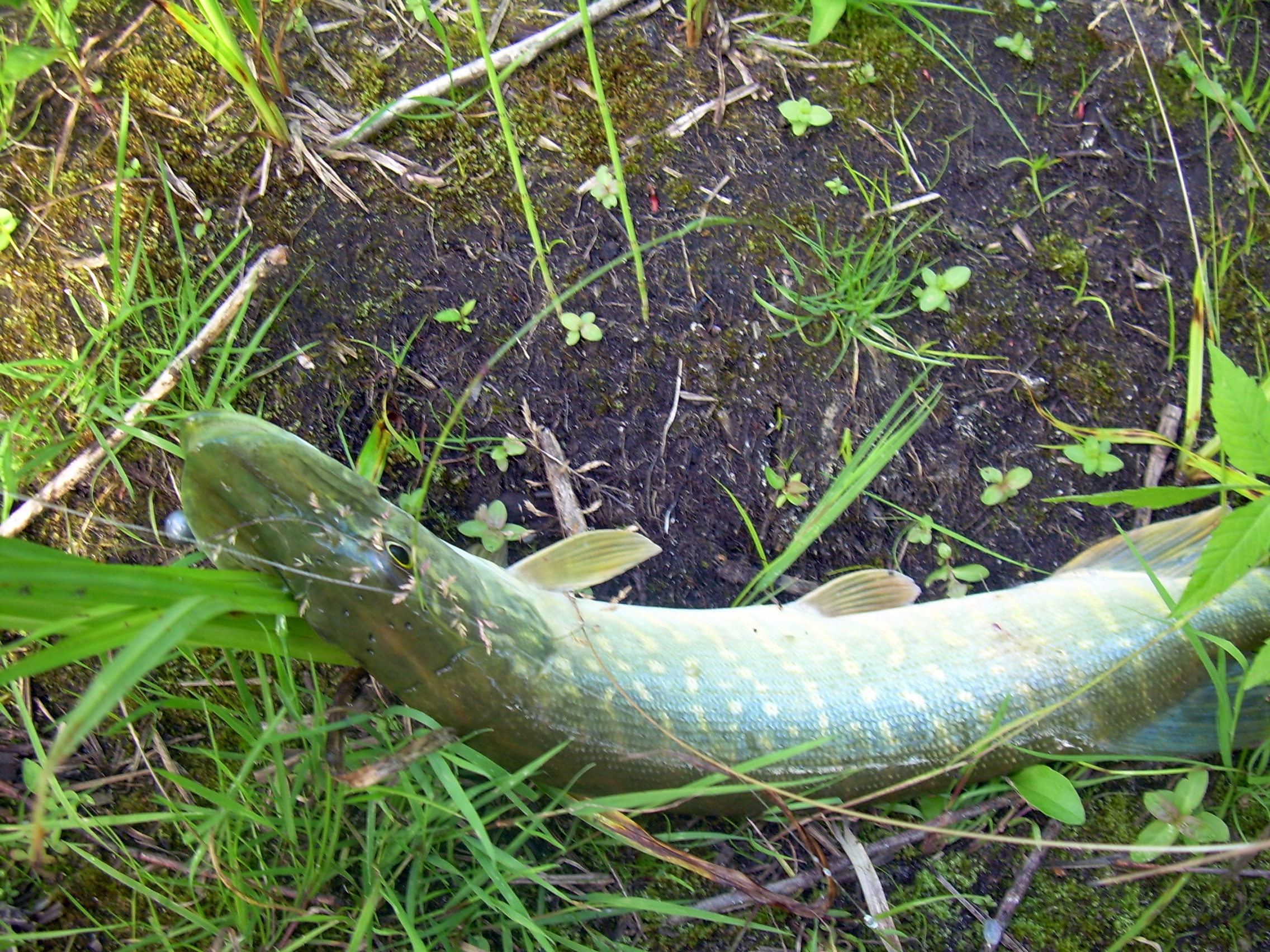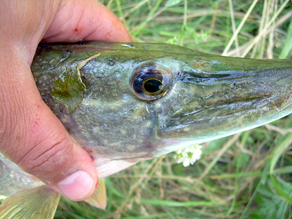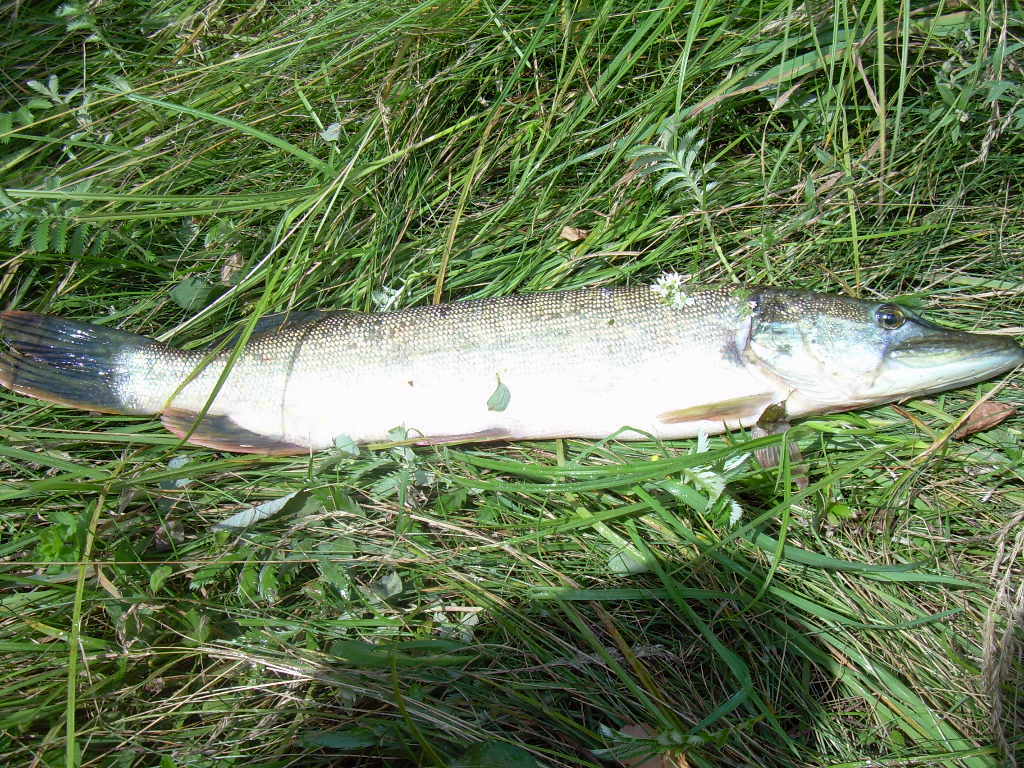 Кидаю и думаю, если-б я словил щучку сразу-бы поехал домой, буквально через 10 мин. ощущаю смааабенький ударчик (не дергаюсь продолжаю проводку в том-же темпе), еще тычек (не понятно рыба или задев за траву) и наконец уверенная хватка – подсечка – ну наконец чувствую нормальное сопротивление и вдруг все ослабло, мотаю как можно быстрее, снова сопротивление, подвожу к себе щуку удивительной красоты: голова зеленая, плавники – хвостовой и верхний тоже зеленые. Беру руками (исколол руки) и прячу в рюкзак. Да, взяла на тоже местную классику Мепс Лонг № 3 белая.