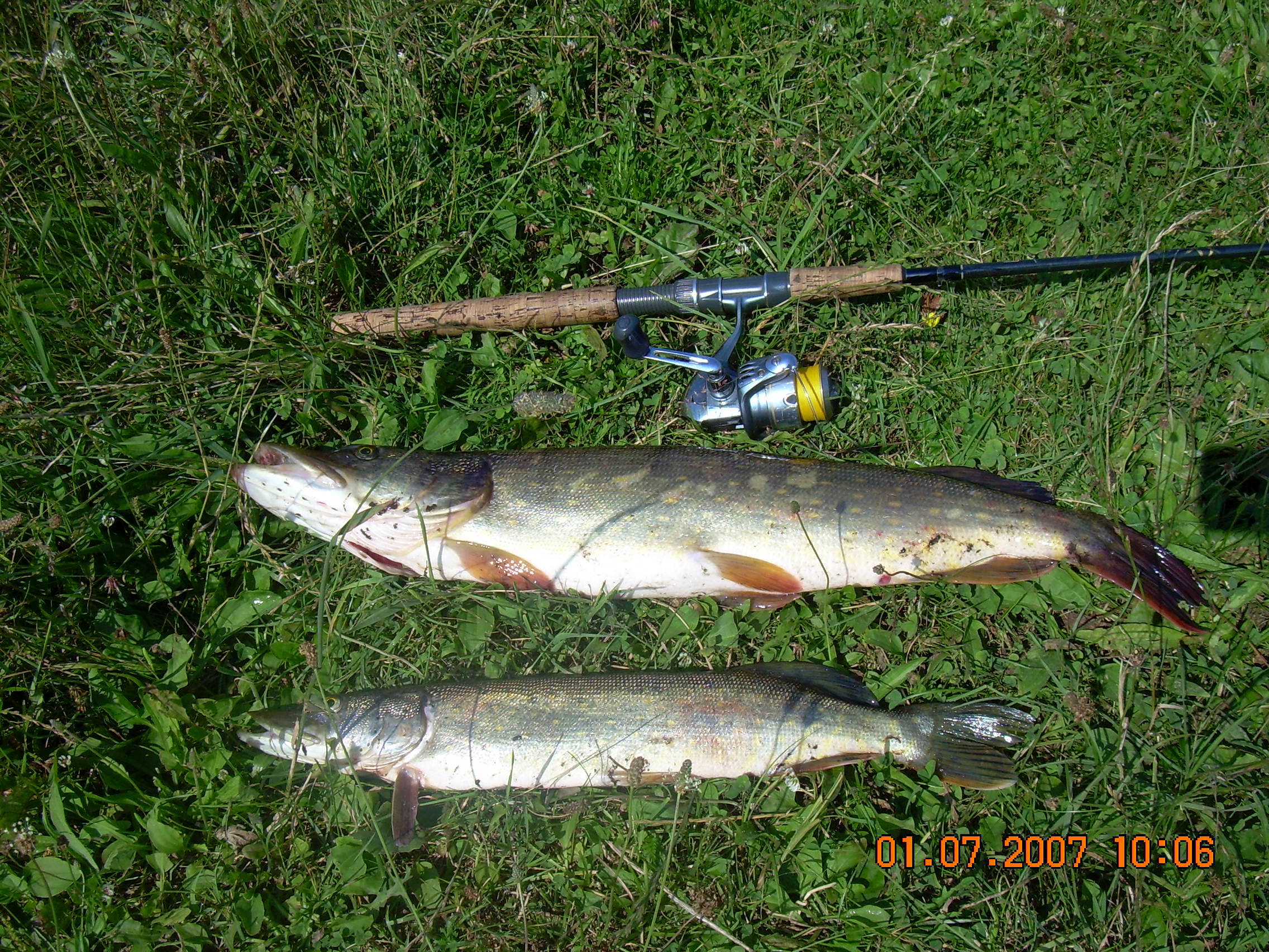 Начинаю как заведено со своего места и около 5 часов на забросе вдоль камыша (там глубина по пояс) более мощный удар чем обычно и сопротивление. Особо насладиться вываживанием не удалось - взяла на расстоянии от меня около 7-8 м. (хотя я думаю стояла гораздо дальше под камышом). Беру руками и несу к берегу, по дороге вырываться и падает в воду, но беру ее быстро вторично и выношу на берег, по дороге через кусты блесна цепляться за ветку и отцепляться от щуки. Щуку несу к машине и кладу в багажник, единственный из неспящик поплавочников тут-же будит своих колег со словами "хорош дрыхнуть вот человек приехал и со 2 заброса словил":gi-gi:
