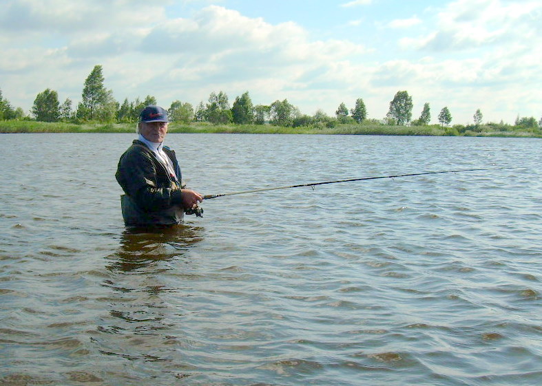 Перекусив на скорую руку заходим в вайдерсах в воду, бррр осчущения не из лучших ветер, что называется ветер в хар.. - лицо, волна и дождь (который впрочем скоро закончился). Около 5-20 ощущаю несильную поклевку – подсечка – есть, вываживаю щупачка грамм 500-600 (словился снаружи под нижнюю челюсть) на забросе от камыша. Начинаю понимать, что щуки под камышом нет – надо делать дальние забросы. Кстати очень хорошо себя показала на забросах против ветра местная классика Спинекс «Леди» - дальность практически не пострадала, а вот при забросе даже под небольшим углом к ветру любые блесна летели значительно хуже (ну «касмастер» конечно не пробовал – не те условия).