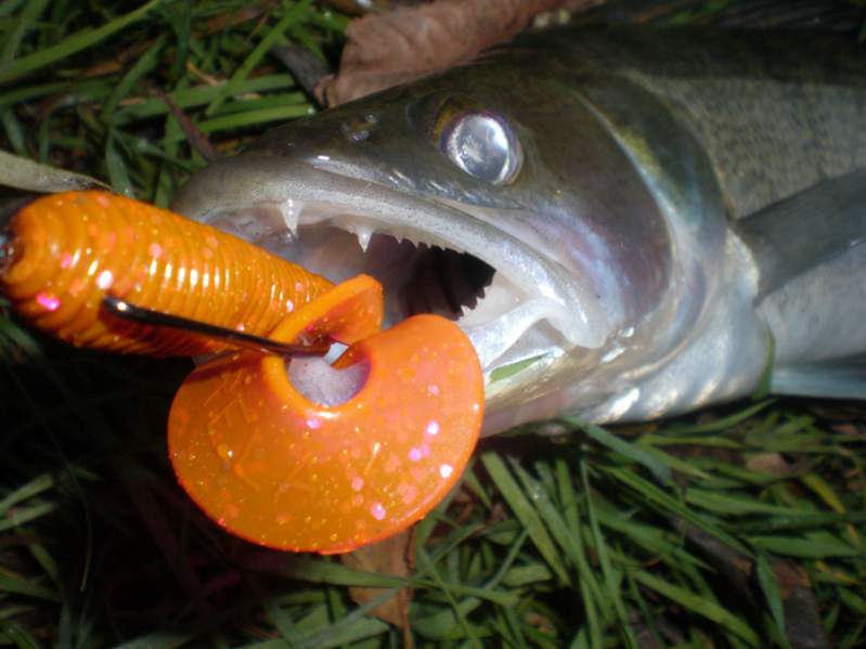 Спершу починаю обкидувати кислотним твістером - який не приносить результату. Міняю на масло і зразу чіткий удар з відгризеним хвостом. Ставлю на офсет такий же і приблизно через 10 хвилин УДАР!!! Подсєчка і тяжість починаю виважувать затягуючи фрикціон, що був ослаблений і на поверхні появляється судак. Намагаюсь кликастого взяти рукою, аж раптом сходить і встромлюється мордой в берег, я рефлекторно руку в воду вспів спіймати рибу за хвіст, але.... слизька ця риба.