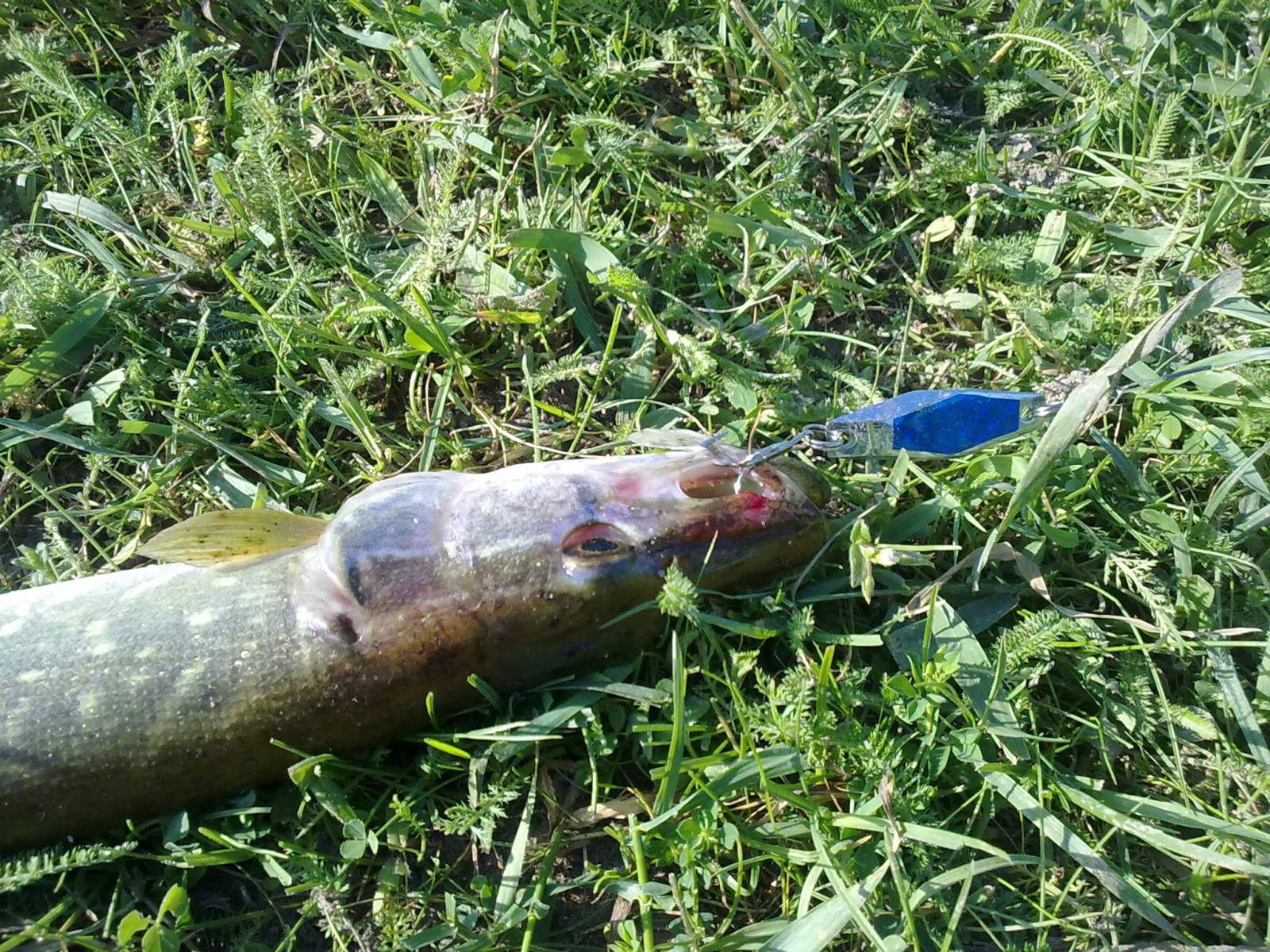 Вчорашній день порадував. Не давав мені спокою недільна покльовка зубатої. Поставив на ту ж саму приманку найменший груз (3гр) який в мене був (причина; не велика глибина та водорості) і після третього закидання удар. Вона мене чекала), ще дві холості проводки і потужний удар. Є, не форсуючи обставин потроху починаю підмотувати, фрекціон потріскує, дві метрові свічки над водою добавили адреналіну. Проблемою було витягнути під берегом (старі гілляки та водорості), але обійшлось щука на березі майже 2кг. Був ще сход шнурка (150гр) на ту ж саму приманку(копито зелено-коричнюватого кольору з бльосками), але це вже не було суттєво, норму виконано.