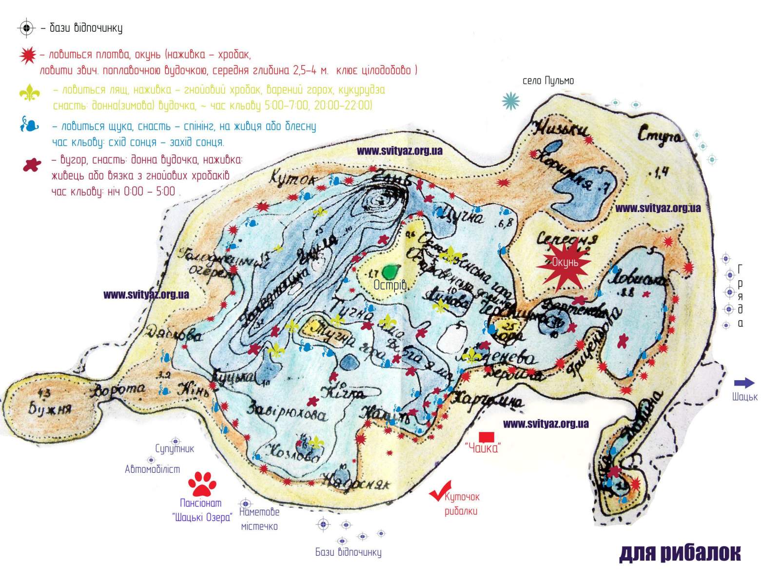 Знайшов цікаву карту з позначенням глибин та основних місць ловлі риби, думаю багато кому стане в пригоді, щоб хоч якось орієнтуватися на водному плесові площою 2750 гектарів.