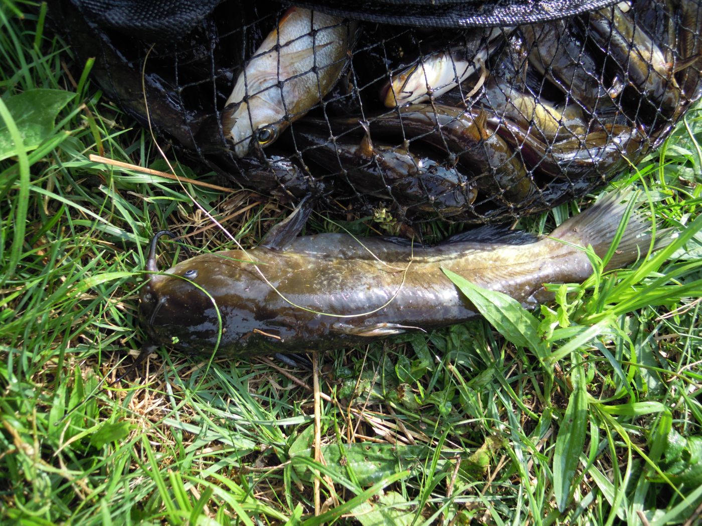Випала нагода і я вирішив сам перевірити рибу в цьому ставку. Для початку в суботу вечером 23 липня вирішив обдивитись ставок та прикормити рибу. Під'їхавши до ставу мене засмутило те що я побачив, близько одного метра став втратив в глибині. Про причину можна легко здогадатись, а пізніше припущення підтвердив сторож - в дамбі утворилася пробоїна, із-за якої витікає вода. На сьогоднішній день пробоїна залишається, пробували закидати мішками з піском, навіть приїзжав воодолаз з досвідом і все безрезультатно. І вот 24 липня з хорошим настроєм і надіями на хорошу рибалку в складі мене,жінки,сина і брата в 06.00 годин ми вирушили на став. Тільки закинули на прикормлене місце поплавчанки- поплавок відразу пропав. Витягую і на великий подив на гачку маленький сомик. Причому в нього по боках і зверху плавники з "голками". Не знаючи цього першим же дотиком я звичайно проколовся, пішла кров, при чому в тому місці навіть трошки припікало. Сом є сом, звичайно відразу він був відпущений. Після 10 хвилин ловлі і пійманих 5 таких сомиків, я став розуміти, що тут щось не так. Через півгодини сторож нам розповів, що це якісь карликові сомики, привезені два роки назад невідомо звідки(і запущині приблизно в кількості чотирох відер). Зі слів сторожа ці прожорливі сомики знищують все, мальок, ікру і т.д. і вихід залишається тільки один- спустити і висушити ставок. Прийшлося чергові соми кидати в сачок. Не дивлячись на те, що не раз руки ранились в мене і в інших ловити було надзвичайно цікаво.Сомики клювали на все, але особливо подобались черв'яки. Пробував ловити фідером на кукурузу - результат той же - сомики. Рибалили до 16.00 з шашликами, відпочинком. В результаті було зловлено сомиків(на фото) близько 4 кг. Самий більший впіймався на фідер біля 20-25 см(на фото). Крім цього 3 маленьких "полосатіка". Знову ж зі слів сторожа минулого тижня був пійманий карп близько 10 кг. Нам не вдалося...Користуючись моментом хотів попросити шановних рибалок написати у особисту пошту адрес хорошого сайту по якому можна оприділити вид риби. Трохи пізніше під'їхали до ставу братова жінка та восьмирічний син. Ним була піймана самостійно перша рибина в житті. Радості не було меж. Не дивлячись на ні одну невпійману достойну рибину, всі повертались додому з хорошими враженнями від рибалки та відпочинку.