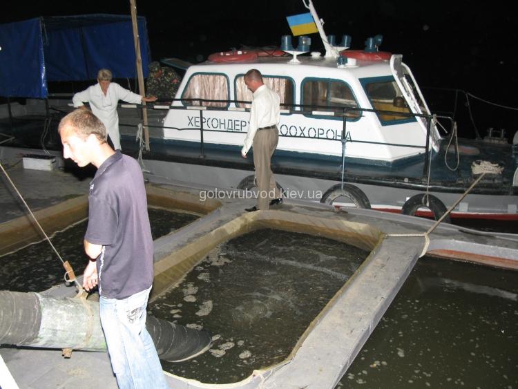 Рыбу, перегруженную в ряд специальных ванн, оборудованных на судне, похожем на баржу, с помощью катера Херсонгосрыбоохраны отвезли до глубокого места акватории, где есть лучшие условия для адаптации мальков стерляди.