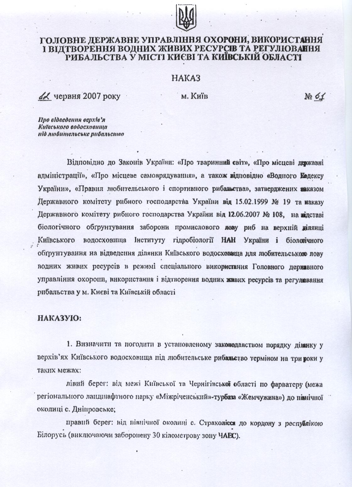 Дополнение к моему посту №12 Киевское водохранилище не входит в юрисдикцию (если можно так сказать) Черниговской рыбинспекции. Там следит за порядком Киевская рыбинспекция. Т.е. черниговские отловочные по всей вероятности там действовать не будут, хоть там и Черниговская область. Границы КВХ определены в нижеследующем приказе (если я ошибаюсь - исправьте, пожалуйста)