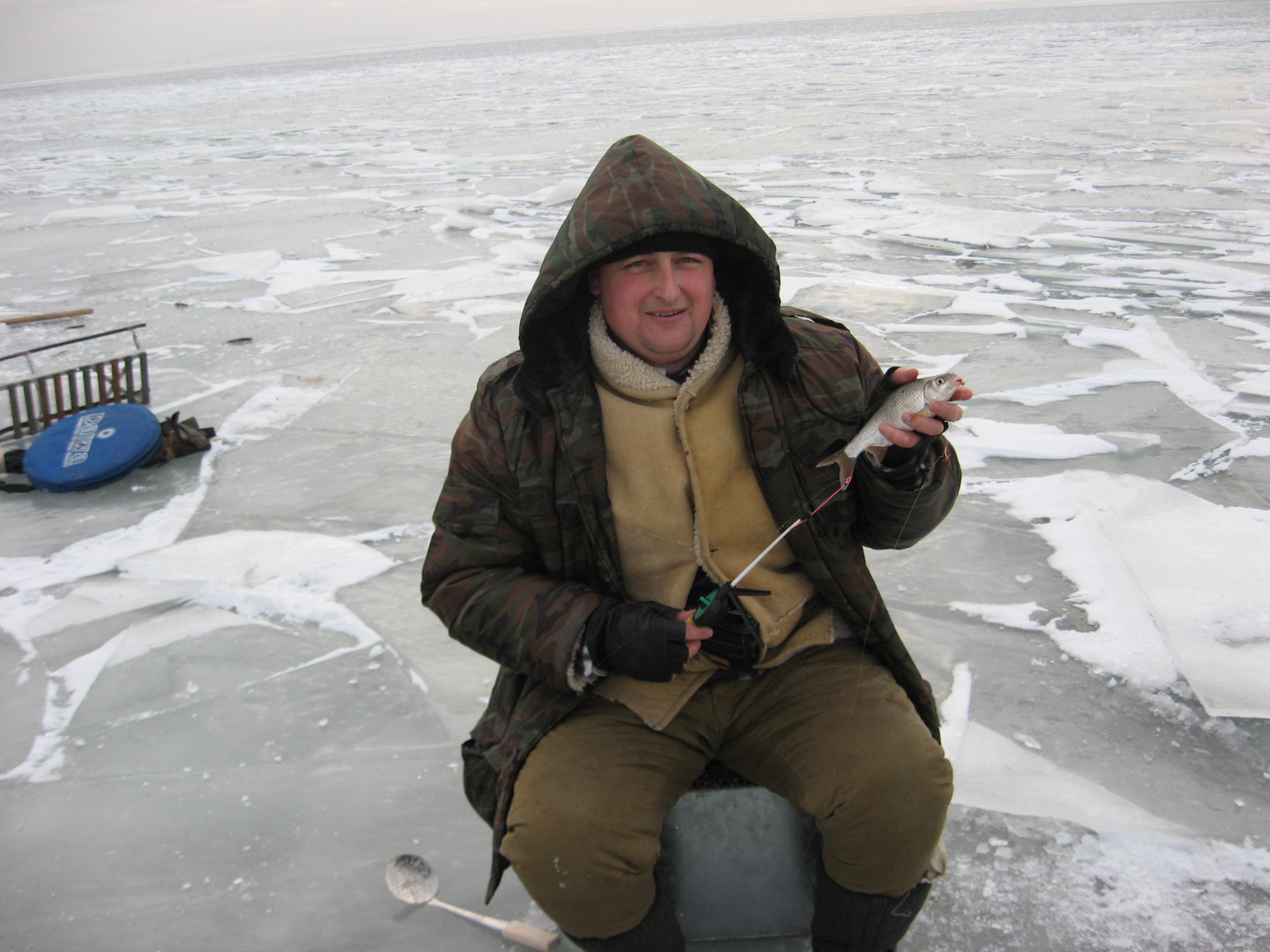 Пасибки за отчеты - почитал и сам решил трошки по поводу Пронозовки наваять. Последний раз были 9.02 - утром в 7.30 уже сидели на лунках. Шли в море около часа и взяли чуть вправо (в сторону Мозолиевки). Просидели до 11 утра - НИ ПОКЛЕВКИ! Решили сняться пойти куда-нить. Выбор пал на Мозолиевку - сравнительно недалеко от берега сидела толпа у раскола льда. Сказали, что с утра кил по 5-6 натаскали. Короче обосновались там - клев был, но слабый и временами. Итог - до половины пятого поймали 7 кг на двоих и почти час ходу обратно. Вобщем получилось более-менее удачное завершение. Хотя были недельку до этого - зашли прямо в море на 25 минут ходьбы - до 10 утра 2 поклевки, потом 2 часа бешенного клева и после часа - таранка в 15 минут. Итог был - 12 кг. Две фотки - на одной результат улова в ванной стекает, на другой - тот злаполучный день (без клева полдня) - наконец то начала брать.