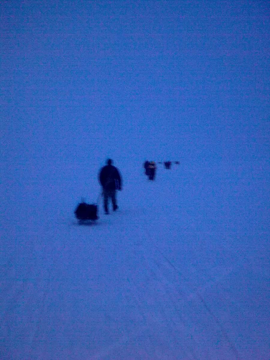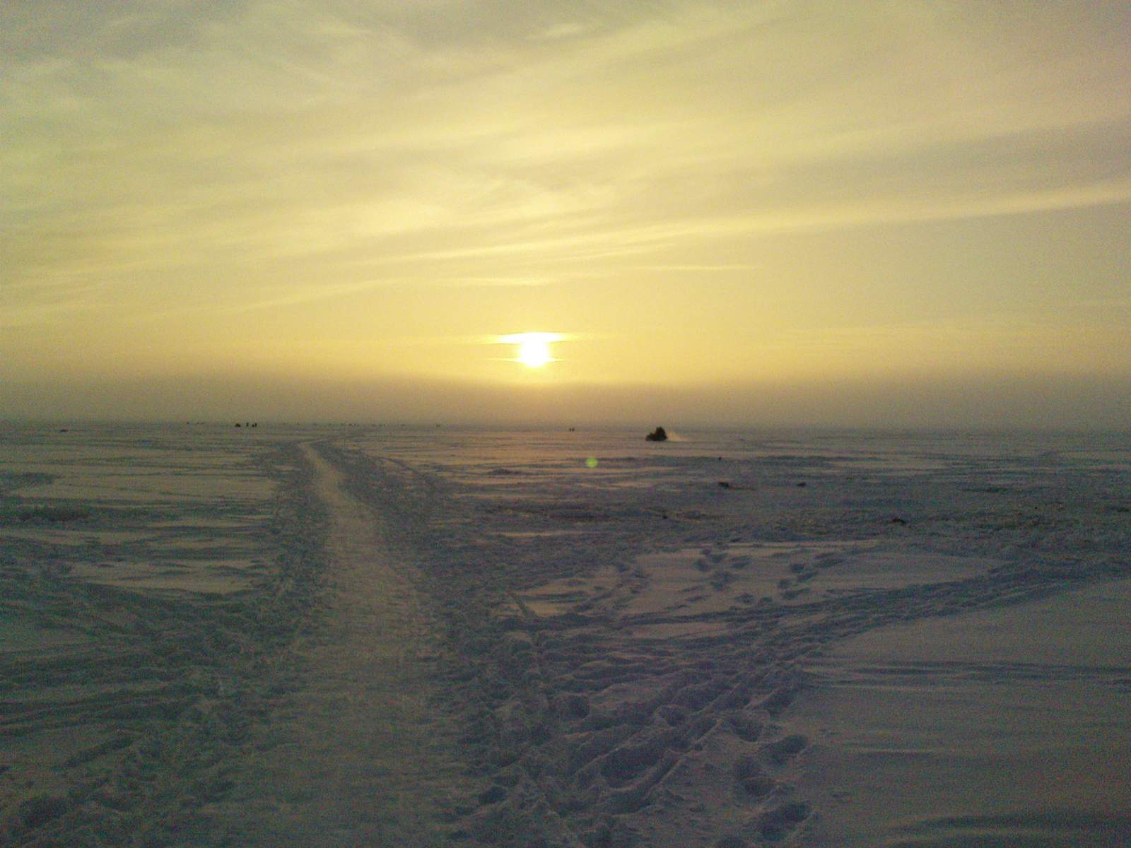 Суббота, Мозолиевка. Устали как собаки... Но обо всем попорядку. Выехали двумя экипажами с Женей Polом около 6ти, с рассветом были уже на полпути к лункам. Нашли Женю и Ко, забурились рядышком и... клев был такой, что не уснуть было сложно. До 11ти не поймано и десятка. Решаем менять место, Женя остался сидеть где был, а мы ушли правее. Посидели полчасика, почесали тыкавку и решили применить научный подход и составить карту глубин. В итоге поблукав, набив десяток лунок, нашли неширокое русло в 7м между двумя шестиметровыми подъемами. Там и сели. И понеслась... Клев был как на черных камнях. Брало на пожованное вымя, которое до конца дня не менялось. Клеваки жадные, у Сани одна и та же таранька хватала на грузовке за оба крючка сразу. Время от времени подкармливал мелкими порциями каши, мотыля и опарыша. Уходили с клева когда уже стало темнеть. Тропу сразу не нашли, а тянуть санки по полумокрому снегу еще то удовольствие... Норму выполнили, воздухом надышались, физзарядку произвели, вобщем день удался!