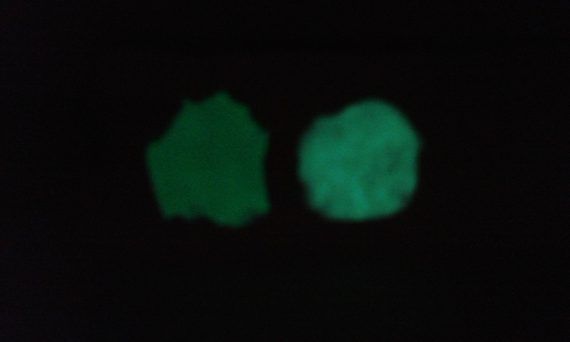 После добавления лака в тат 33, он стал ядовито зеленым. Похож на лак которым красят кончики квивертипов и поплавки. Очень хорошо светися в УФ свете и продолжает светися самостоятельно в темноте. Нанес на бумажку два лака, подержал 30 минут на подоконнике и положил в темном туалете на бачок. Сфоткал через 15 минут. С фото видно что DLO-7A чуть ярче. Чез 30 минут, пятна тускло светились но фотик уже не видел. Через час, тоже было видно эти пятна в полной темноте, но еле еле.