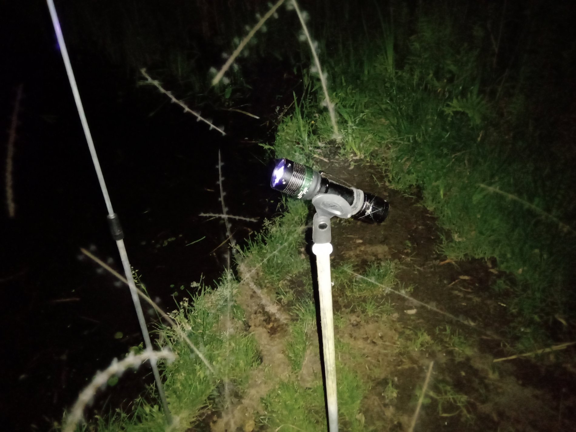 В первом фото - все видно и от простого фонаря. Поскольку у меня кольца покрашены светонакоптельным лаком, то и они тоже видны при простом свете. Ставим УФ фонарик на стойку и направляем луч на фидер.