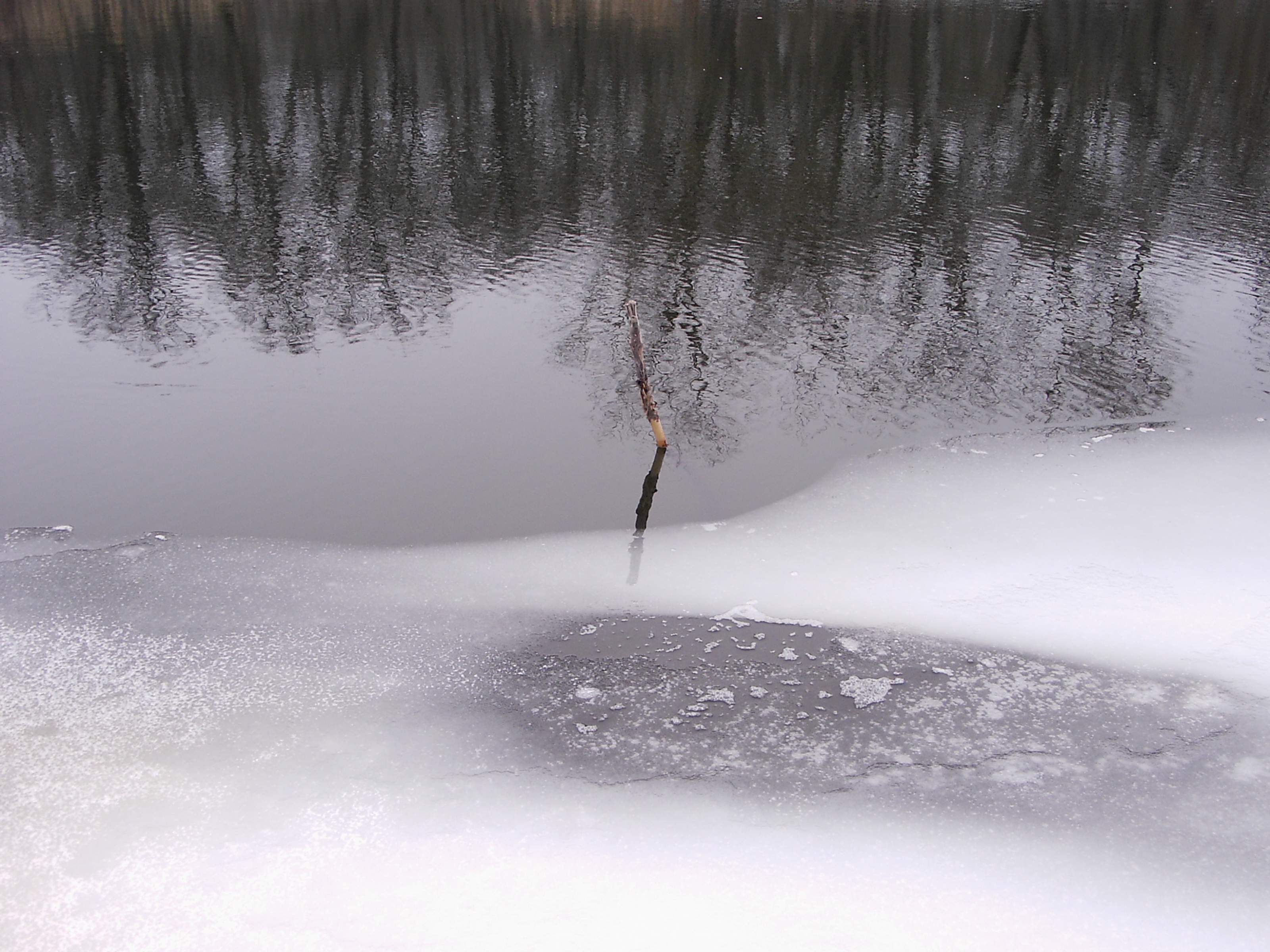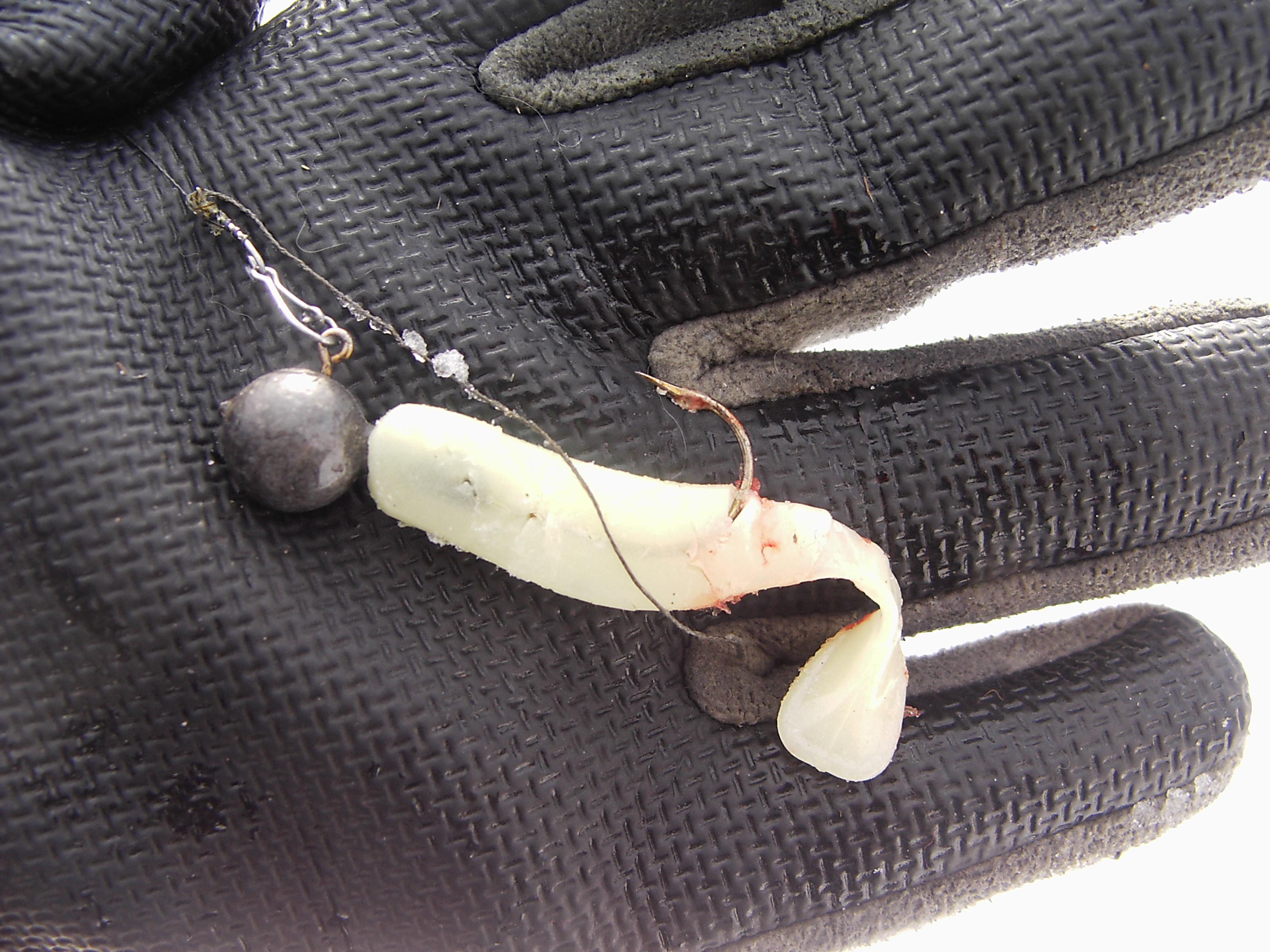 Приехали еще по темноте, до рассвета еще час, решили перекусить. Как оказалось ребята взяли с собой коньяк, пока произносили тосты наступил рассвет. И вот они первые забросы! Все взялись тщательно облавливать выбранные ими точки, кроме меня. В Андреевке я предпочитаю делать с одной точки в среднем забросов десять и менять позицию. Рыбных точек много, а время активности рыбы по долгу не продолжается. Клев начался с пол восьмого утра, именно тогда я почувствовал первую поклевку. Подсекаю, взялась в двадцати метрах от ближнего берега, с русла. Подвожу ее к закраине льда и сталкиваюсь с проблемой. Закраины в некоторых местах достигали четырех метров. Однако щука оказалась небольшой, грамм восемьсот, она быстро устала и я выбрав момент попытался выдернуть ее на лед. Но щуренок оказался везучим, в момент рывка умудрился как-то извернуть голову с края льда и укусить закраину. Из-за чего мое усилие высвобадило щуренка с крючка, только и видел как он мелькнул на глубину. Озадаченный этим происшествием делаю еще пару забросов с этого места и продолжаю путь. Виталик так же решает не задерживаться на одном месте и мы с ним двигаемся обгоняя друг друга. Через пол часа добираюсь до облюбованной мной рыбной точки, облавливать начинаю с учетом, что все забросы надо делать левее от положения стоя лицом к реке, так чтоб приманка шла по течению и нивкоем случае не против течения! И моя наблюдательность за повадками здешней щуки не подвела меня. Удар был слабым как и предведущий, не огрессивно взяла приманку. Начинаю вываживание и чувствую сильное сопротивление, щука упирается так, что приходится ослабить затянутый фрикцион. В ходе борьбы выбираю место где закраина самая маленькая, метра полтора два и подвожу щуку туда. Возле края льда щука начала сопротивляться как обреченная на смерть вольная рыба. Спустя какое-то время она спокойно замирает и я пытаюсь подвести ее поудобней к краю, подсак в машине метров за триста от меня, принести его все равно не успеют, решаю взять ее без подсака. Но не тут-то было, она делает рузкий рывок в сторону, забирает метра полтора лески и обплывает вокруг вбитого в воду кола, (его можно увидеть на фоторгафии) зачем там этот кол кому-то понадабился я так и непонял. Решаю не отчаиваться, аккуратно захожу на закраину, дотягиваюсь кончиком спиннинга до шеста и намериваюсь раскрутить обмотанную леску. Тут же щука делает еще два оборота вокруг шеста и рывком сходит с крючка... Мой крик был слышен очень далеко. В щуке было килограмма два с половиной, это была бы самая крупная в моей жизни щука. По крайней мере я получил огромное удовольствие от вываживания и порадывал взгляд своим спутникам, хоть и не испытал того довершающего чувства которое ты испытываешь вытащив рыбу на берег. Два схода за один день это уже не та арифметика которая мне по душе. Продвигаемся дальше, уже под конец уловистого участка реки встречаем группу рыбаков, стоило мне от них отойти, как один из них берет щучку в районе килограмма. Прочесуем реку в обратном направлении, ни кто из ребят пока так и не обловился, а у меня из-за отстрела и второго схода щуки, остался всего один предатор троечка расцветкой крабовая палочка, именно эта расцветка является моим секретным оружием по щуке в Андреевке. Начинаю нервничать, неужели так и уеду несчем? Но нет, снова поклевка, щу