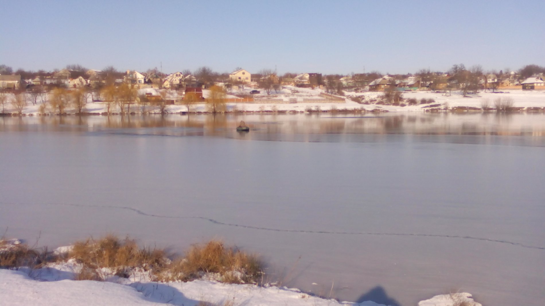 Приехав на ставок, немного разочаровался, ставок замёрз, но не так как хотелось. Вдоль берега 15-20 м лёд с талым снегом 2.-2.5 см, по средине 1-1.5 см. Хотя рисковые ребята ходили вдоль берега и били лунки. На средине в районе тырла, ещё один находчивый рыбак, на лодке перемещался по льду с помощью пишни и таким образом облавливал ямы и перекат от старой дамбы.