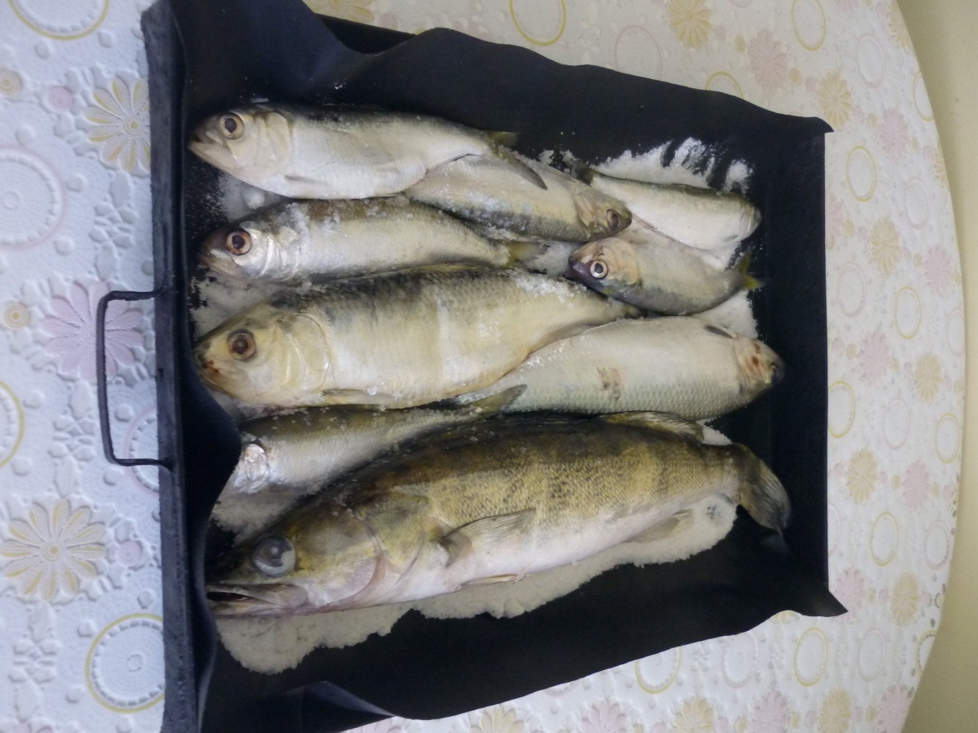Всех приветствую! Стратегический запас пузанка прошлого года подходит к концу. Сегодня приготовил новое для себя блюдо - Пузанок запечённый в соли. Ранее так готовил другую рыбу, но вот решил так сделать и пузанка. Для заполнения места в противне нашёл в морозильнике судака и запекал их вместе. Всё очень просто - на противень ложу тефлоновый коврик, затем слой соли, на соль укладываем рыбу и покрываем солью с таким расчётом, что бы соль покрыла все открытые части рыбы. Рыба не чищеная и не потрошёная - это основные условия что бы получилась вкусная и сочная рыба. Запекаем в духовке 1 час при 200 градусах. После приготовления снимаем корку соли с рыбы, перекладываем в ёмкость и с удовольствием кушаем. Кстати, на фото это не судак маленький ( размер судака 40 см. ), а пузанок большой ( попалось и 2 селёдки ).