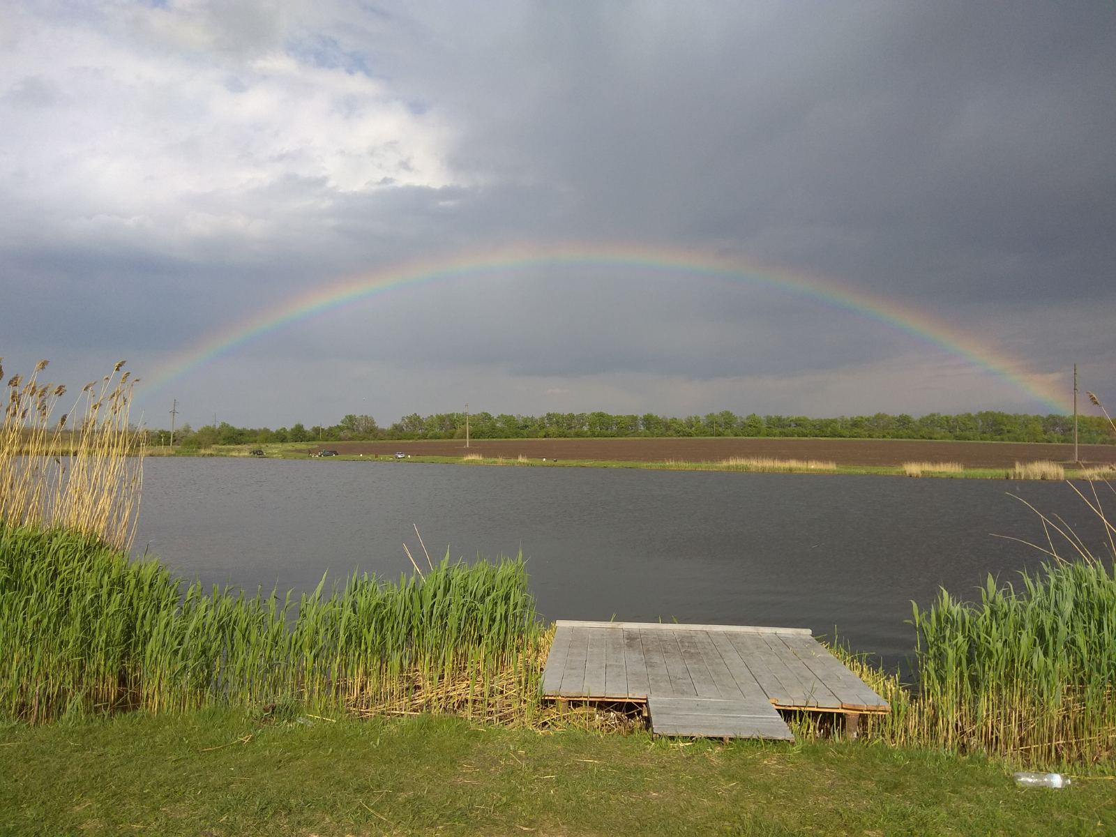 , то ли еще из-за чего, но после 10-00 вообще клев по всему ставку пропал (ветер унес зонт на ту сторону, пришлось всех обойти))До 10-00 успел получить 2 поклевки - карпики 1,7 и 1,1 кг на флет-методные кормушки с вафтерсами. В принципе рыбалкой остался доволен, удобные места с помостами (правда не во всех секторах), красивая природа, дождик перед отъездом побаловал радугой, трофей не поймал, значит подрастает :podmignul:.