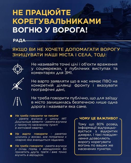 Міністерство оборони вкотре застерігає українців від поширення в соцмережах інформації, яка може зашкодити українським захисникам і зіграти на руку російським окупантам. Джерело: заступниця міністра оборони Ганна Маляр у Facebook Пряма мова: "Не працюйте корегувальниками вогню у ворога! Так-так, саме це ви робите, коли публічно повідомляєте точну адресу - куди влучила або не долетіла ракета. Ми справді вільна, демократична країна зі свободою слова. Наше суспільство вже звикло до відкритості і висвітлення в Інтернеті абсолютно всього. Але війна - це в тому числі обмеження на поширення певної інформації - заради вашої ж безпеки… Не варто, як один з мерів, заявляти що в нас немає ППО на конкретній ділянці фронту і вказувати географічні дані, не треба як ще один з мерів - говорити публічно, що для заїзду в місто залишилась безпечною лише одна дорога і називати яка саме (люди між собою і без цих заяв знайдуть як передати таку інформацію). Такі детальні повідомлення допомагають ворогу і ставлять під додаткову загрозу ваші населені пункти. Під час війни фатально небезпечно повідомляти про знаходження або відсутність будь якого озброєння та ввійськової техніки ЗСУ з прив’язкою до населених пунктів.