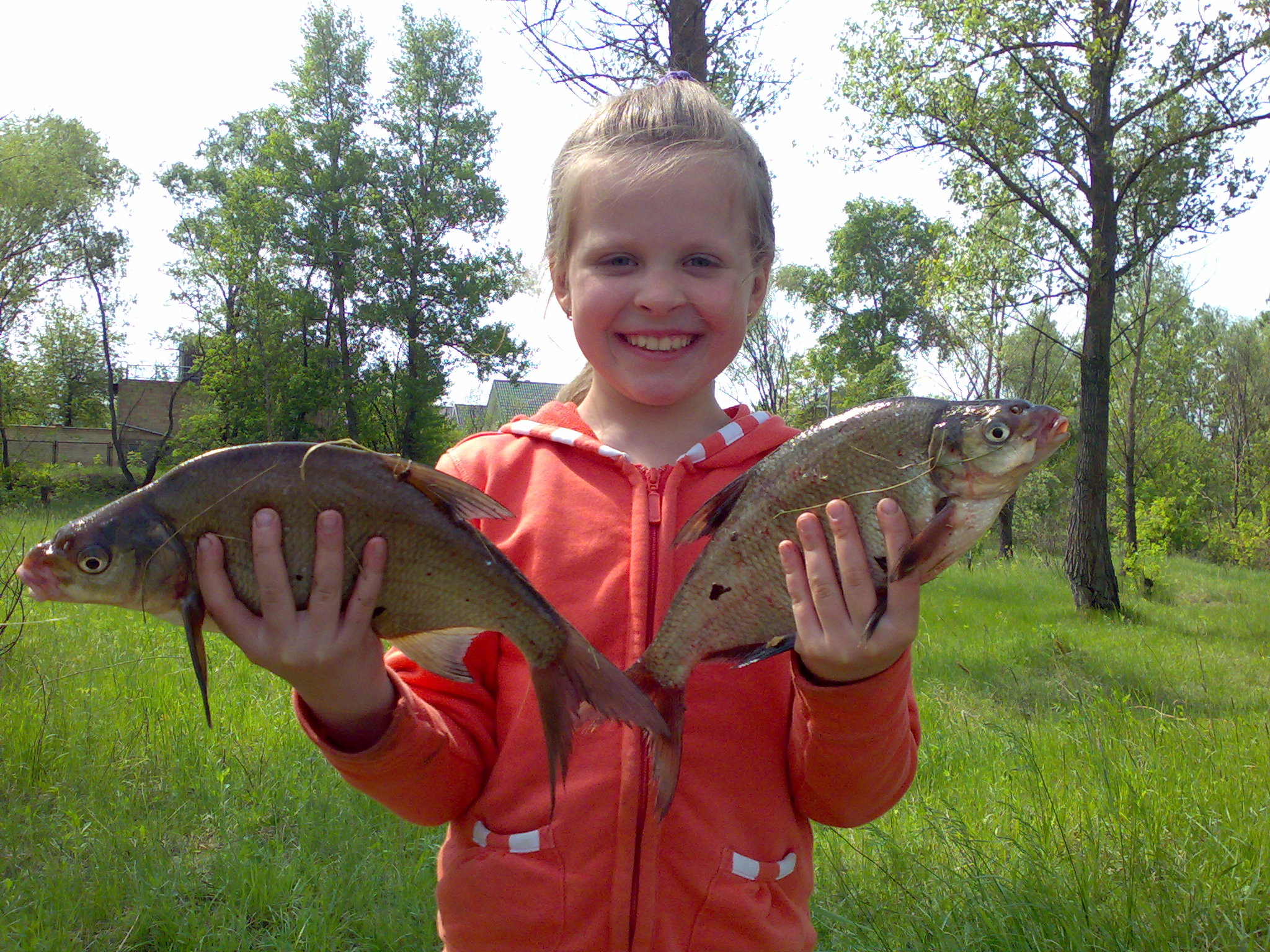 9 мая дочка вытянула на рыбалку. Смастерил ей что-то типа фидера (стеклянный спин + мясорубка). Результат на фото. Помогал только подсакой.