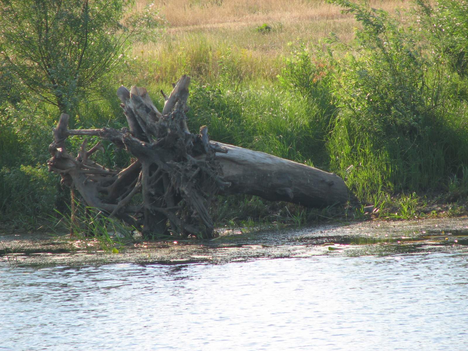 Вода очень низкая. На фото коряга, которая по осени была наполовину вводе.