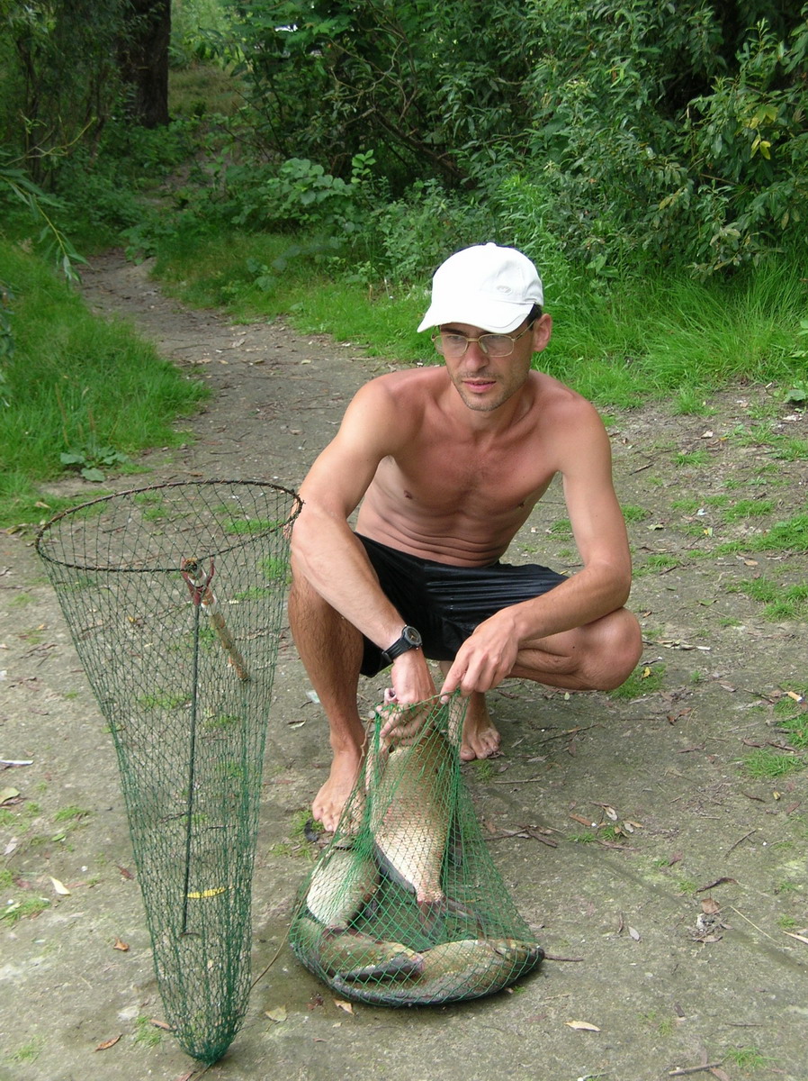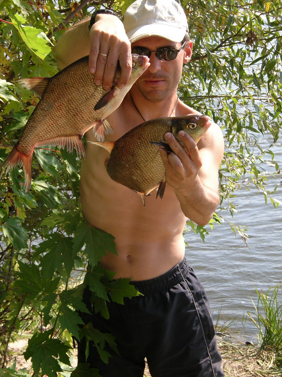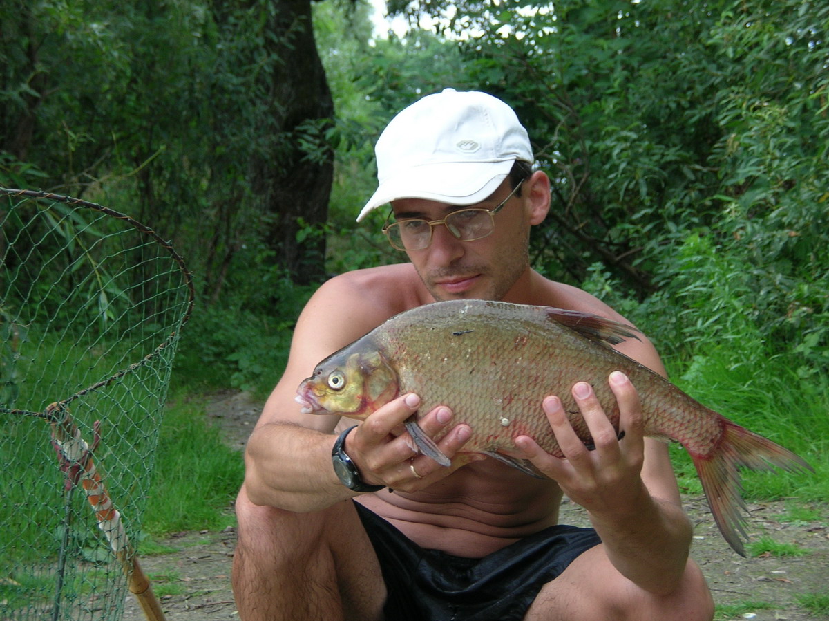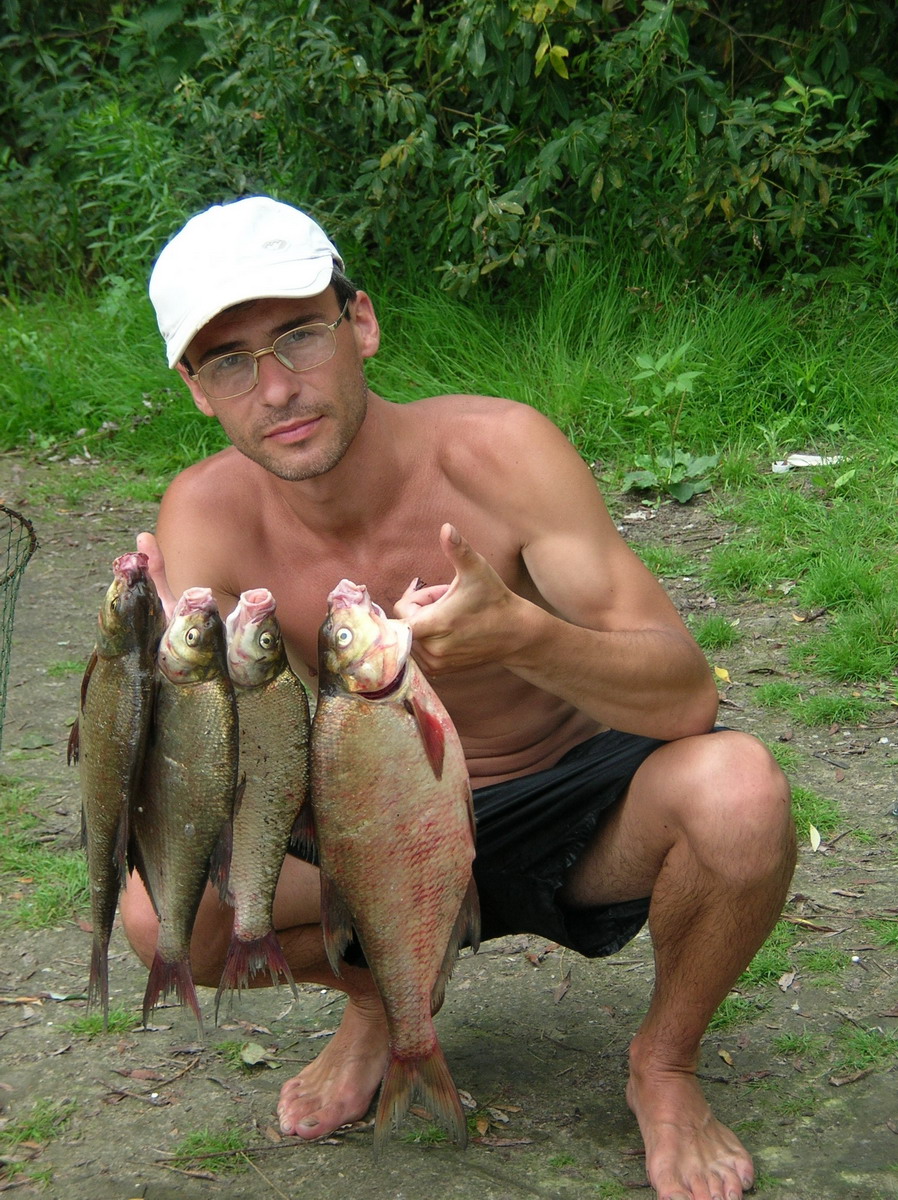 И еще в этом районе нередкий гость- дикий деснянский сазан, клев которого очень яркий. Прут, стоящий на рогачике вдруг резко клюет носом вниз, ручка подлетает, а невка визжит как болгарка. Только в руки возьмешь- натянет и обрыв. Такое действо у нас называют- "электричка прошла." Вынимаешь- поводков как небыло. Мне кажется он не на пенопласт вовсе зарится, а засасывает всю кормушку, набитую горохом и просто себе идет дальше. Сопло то у него- будь здоров. За все время отдыха был свидетелем поимки последнего только два раза. С одним даже пофоткался (не мой, словил сосед по базе, сын моих друзей в возврасте 14 лет). Неделю по базе как король ходил.