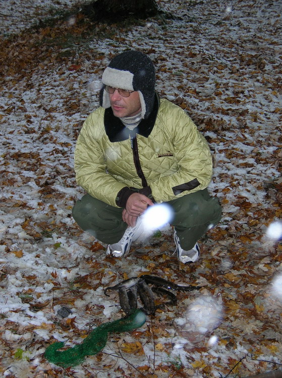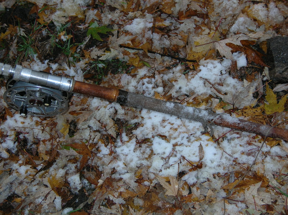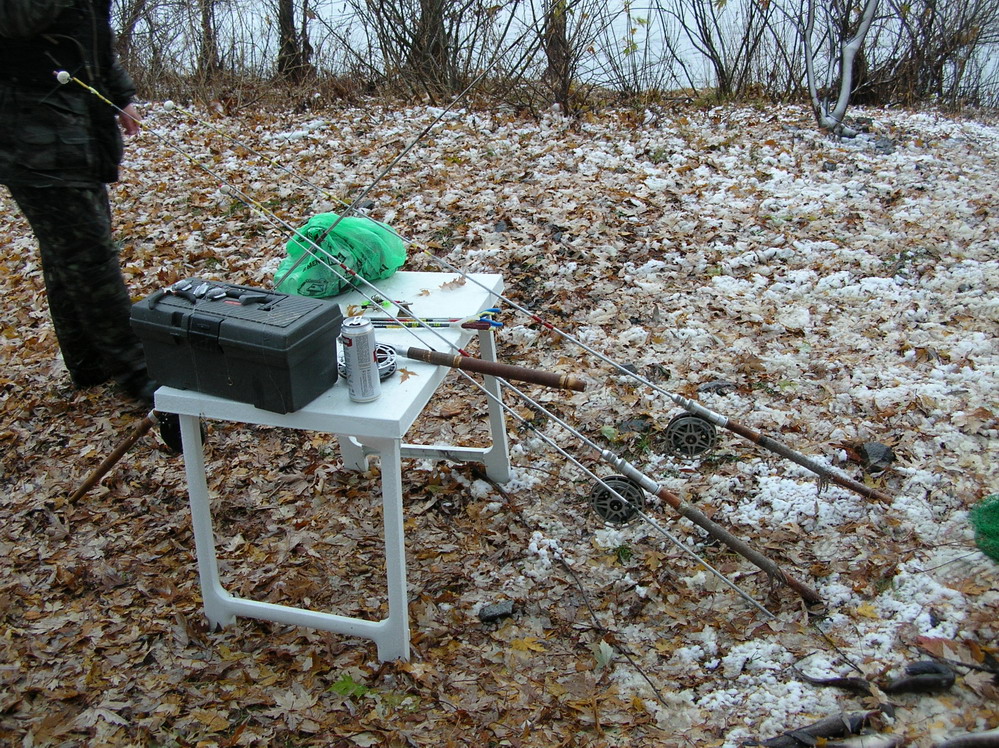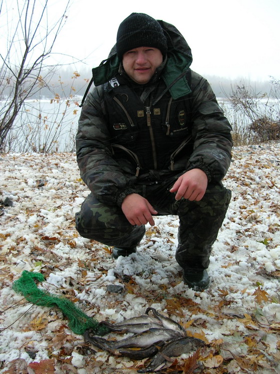 Клев был равномерный, всю ночь, но слабый. Видно еще тепло для него. В качестве наживки использовали резаного коропа. Из четырех прутов работали только три. Не рабочий носили с места на место, но результатов это не принесло, видно пороблено. В 3.00 похолодало на пару градусов и пошел снег. Клев правда не улучшился. Итог 6 штук, парочка под 800гр.