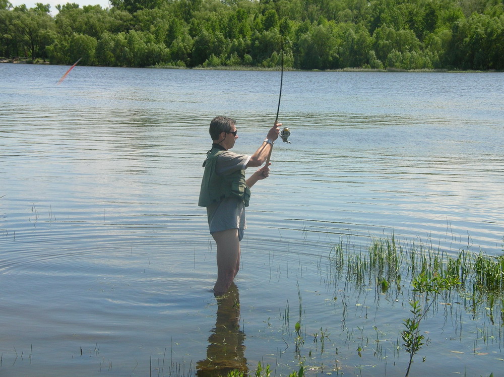 Сегодня были на Десне. В основном ездили покататься на велах :) Но взяли с собой одну поплавочную и один спиннинг. Были в устье то ли старицы, то ли притока - если смотреть по карте, прямо над Троещиной и примерно на уровне Зазимья, километров несколько от города.