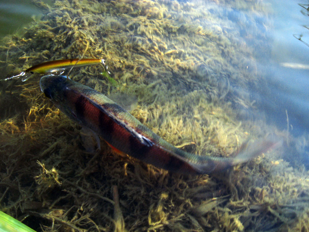 15.07. Ю.М. С 19-00 до 22-00. Пришел поздно, окунь уже ушел на дальний кордон, но парочку клюнуло сигаретного размера. В 20-00 перебрался на пляжик. Четыре броска и четыре язика гр по 300 на маньячку. Потом еще 5штучек, но с ладошку, и жерешок такого же росту. Перешел на голавлиную точку. Заработал два щипка такой силы, что думал останусь без маньячки. Потом перешел на судака. Один детский сад, 200-300гр. У воблера хвост целый:), не откусили. Разловил 3D миноу. Правда как я уже убедился, мелкому судаку пофиг что ему под морду подсовывают, жрёт всё прогонистое и шевелящееся в воде:)