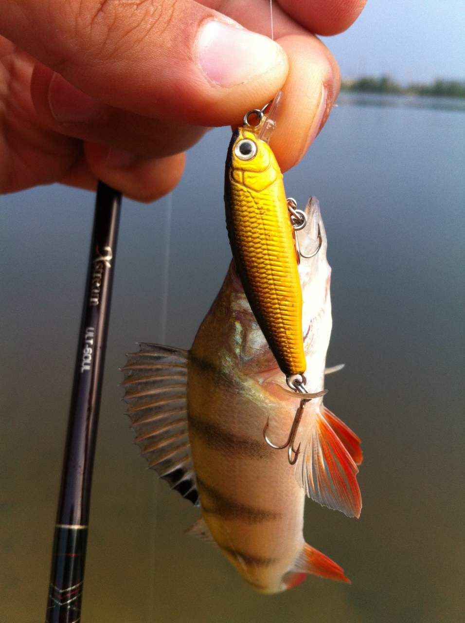 Сегодня утром в озере удалось наджиговать чуть окушка. Все крутые окуневые воблеры молчали.. полоскал, полоскал..