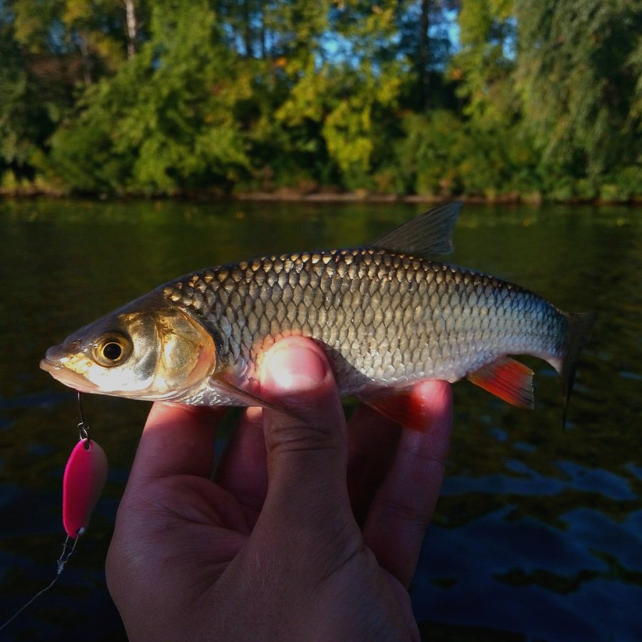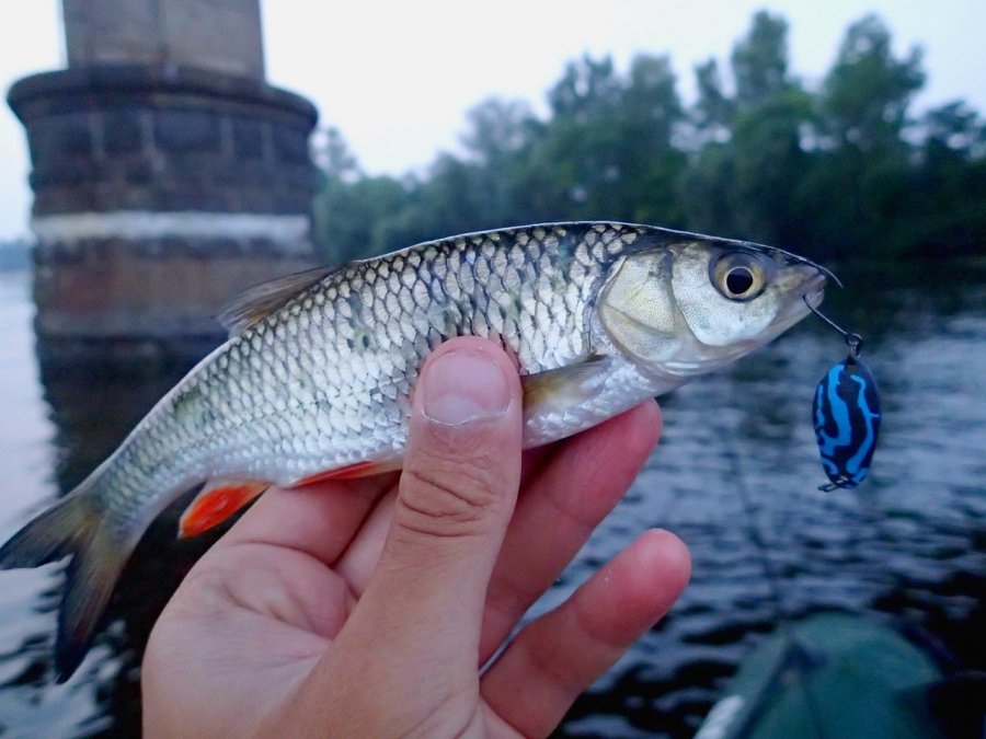 Обловив очередную точку,я предложил поехать на знакомый мне,небольшой перекат.Зная любовь Максима к белому хищнику,я раскрыл не большой секрет места и уже через пару забросов Макс паркует первого голавля.Я в это время джиговал и продолжал ловить маленьких окуньков,просто не мог остановиться в этот вечер :) Максим получал клеваку за клевакой и когда я рылся в кошелке в поисках правильной блесны,в лодку залетел уже не плохой Язик.После таких раскладов нам составила компанию еще одна лодка и рыбалка на перекате закончилось.