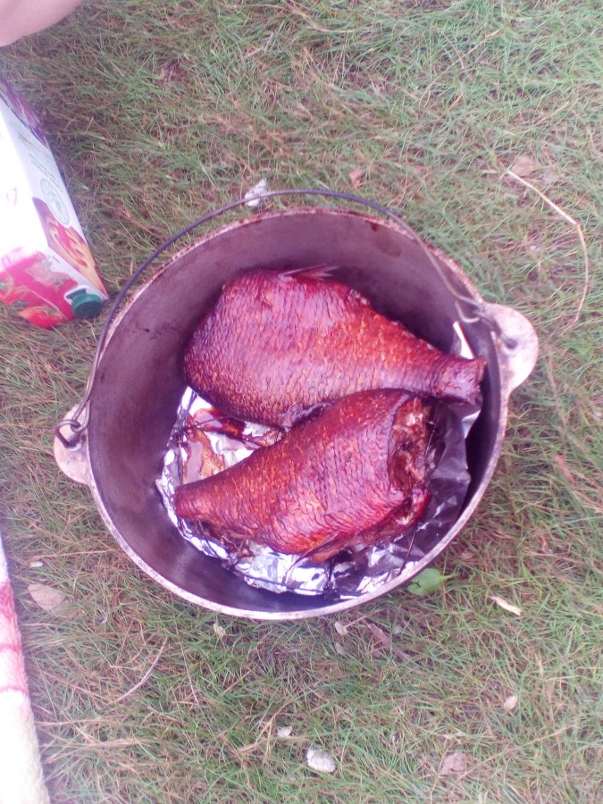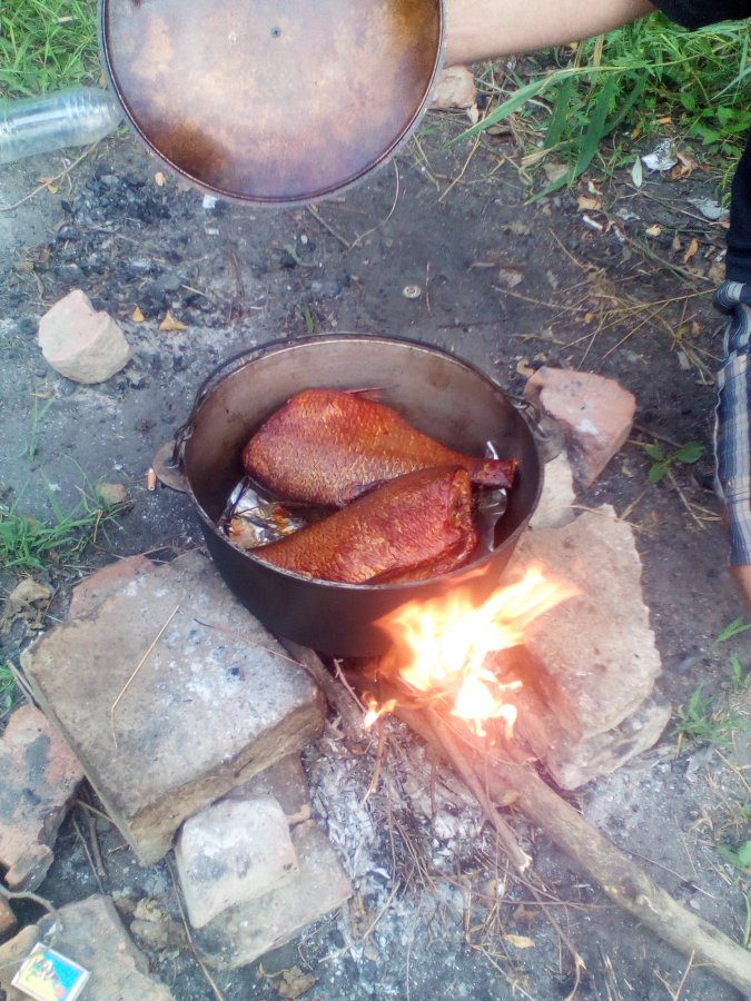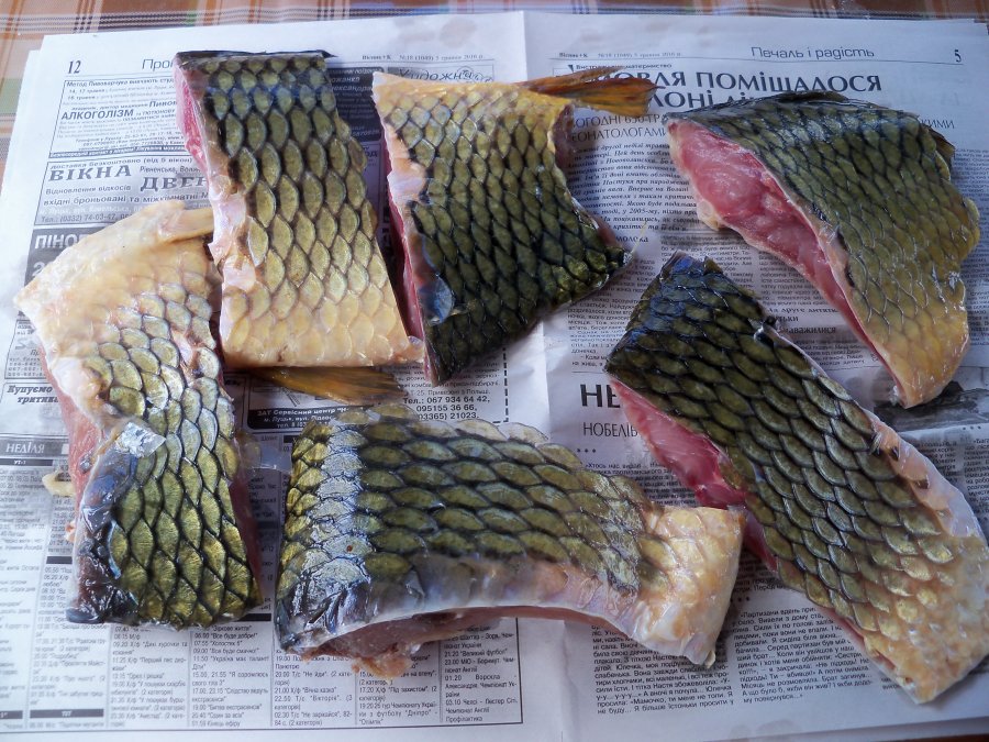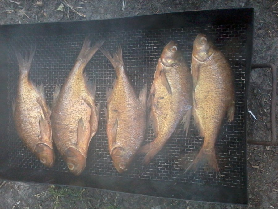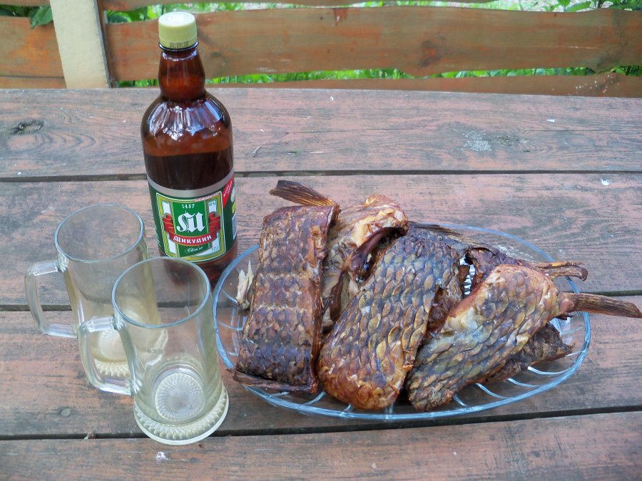 Спочатку карпа чистимо та солимо. Потім промиваєм та підсушуєм. Насипаєм стружку та викладаєм рибу на полички. Тримаєм рибу 30 хвилин на вогні. Потім знімаємо з вогнища та даємо з відкритою кришкою прохолонути хвилин 10-15. Ну і аж тоді викладаємо на тарілку, та достаєм холодне пиво з холодильника. Смачного.