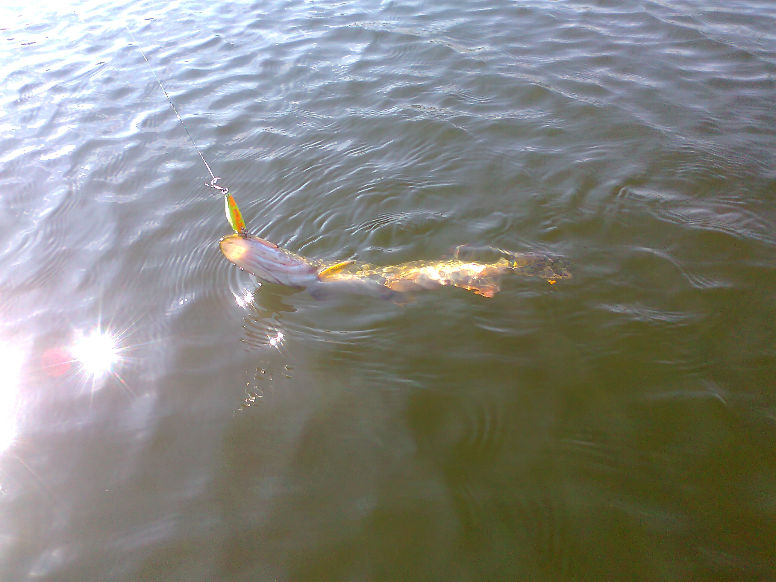 Приехали под вечере воскресенья, до темноты оставалось не много времени, поэтому далеко не плавали, прополоскали приманки в районе родных пенат безрезультатно до наступления сумерек, поехали ужинать... Лодку решили не спускать а примастырили буксировочным тросом на крышу авто, прикольно ехать. Потренировался ездить со скоростью 30-40 км/час, а то так ползать не умею :) Зато утром еще серело, а мы по-бырику уже на воде. Утро не принесло желанных поклевок и трофеев... Ближе к обеду вымучил на микруху пару окунчиков неприличного размера, утопил... Потом была парочка покрупнее, и один столовый, на попер взял щучку грам 300, выпустил бы, но очень повредила жабры при атаке и своих выкрутасах в воде. Классно все таки на легкий спин ловить пусть даже не крупную рыбу, удовольствия вагон! А вот фоток хороших нет... Не рискнул брать в лодку телепон и фотик, что бы не утопить как в прошлый раз... У встреченных спинингистов, тоже очень слабо, а некоторые воошпе с ОП плавали...